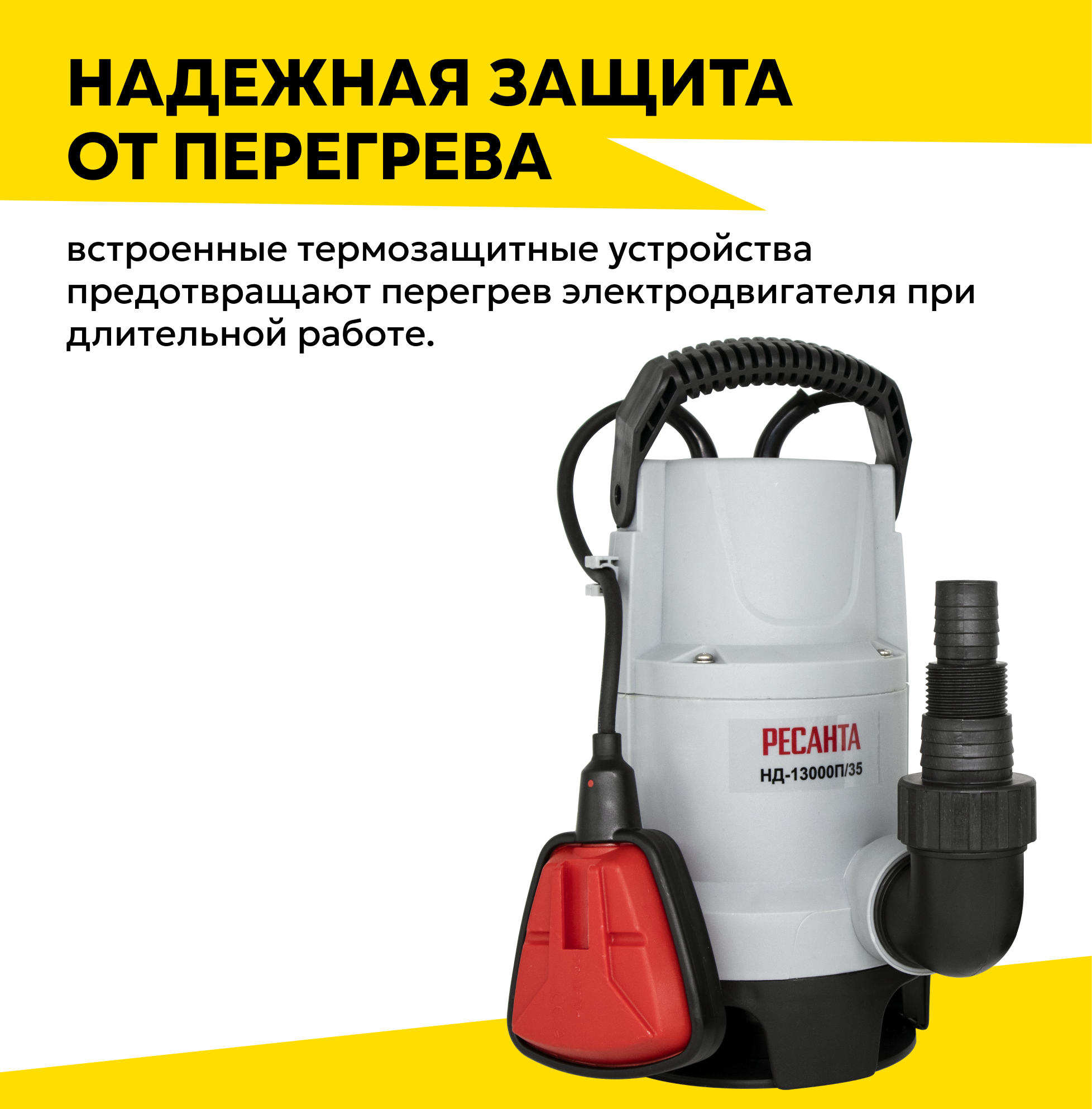 Насос / Дренажный насос НД-13000П/35 Ресанта (550 Вт, макс. напор – 8 м, 13000 л/час, для грязной воды, диаметр пропускаемых частиц – 35 мм, 1.5“)