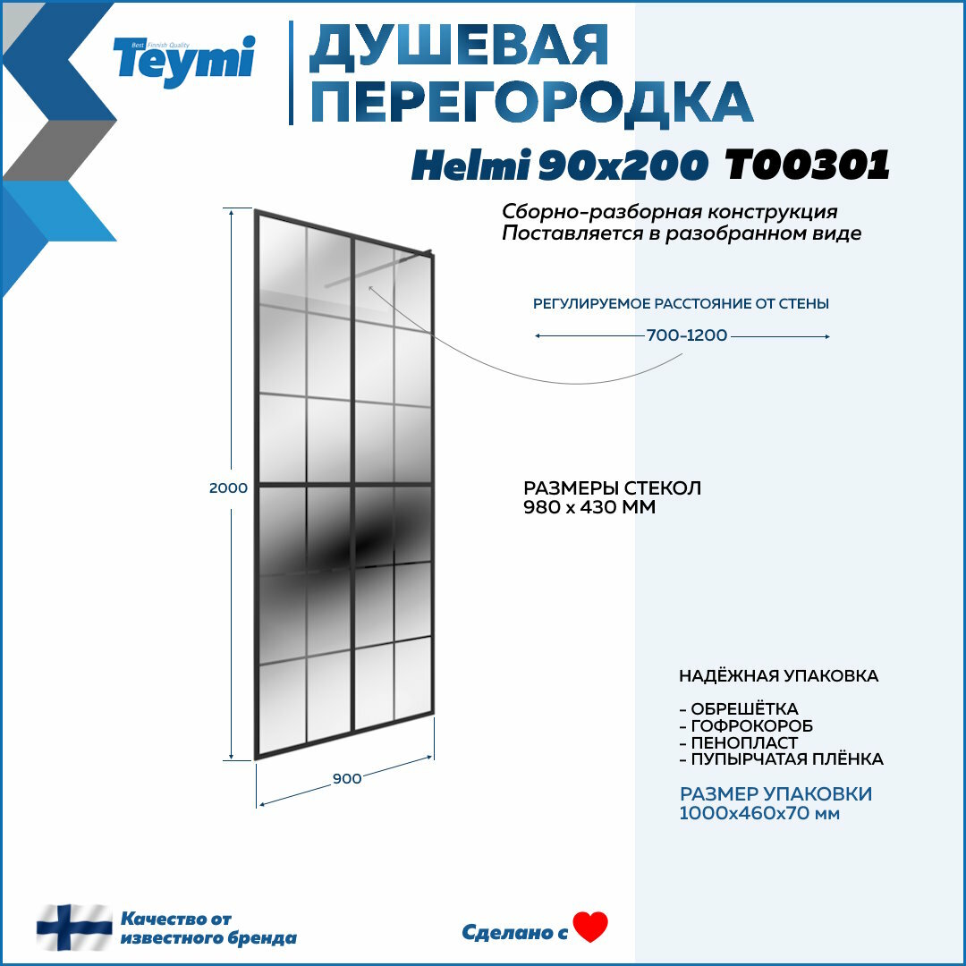 Душевая перегородка Teymi Helmi 90x200, прозрачное закаленное стекло, профиль черный матовый T00301