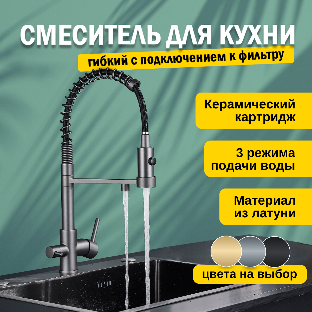 Смеситель кран для кухни с фильтром для питьевой воды, с гибким изливом, кран кухонный серый, латунь