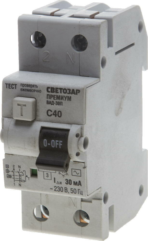 СВЕТОЗАР Выключатель дифф. автоматический СВЕТОЗАР "премиум", 2-полюсный, 40 A, "C", "AC", откл.диф.ток. 30 мА, 230 / 400 В , ( SV-49212-30-40-C )