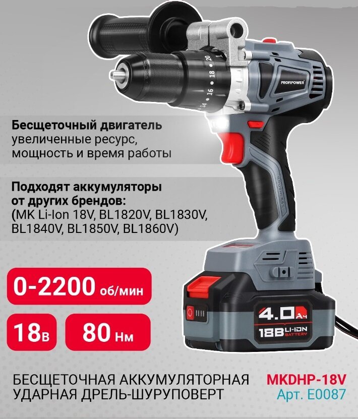 Аккумуляторный шуруповерт бесщеточный ударный PROFIPOWER MKDHP-18V 18В 80Hм 2акк*4,0Ah+з. у, Е0087 интересное: