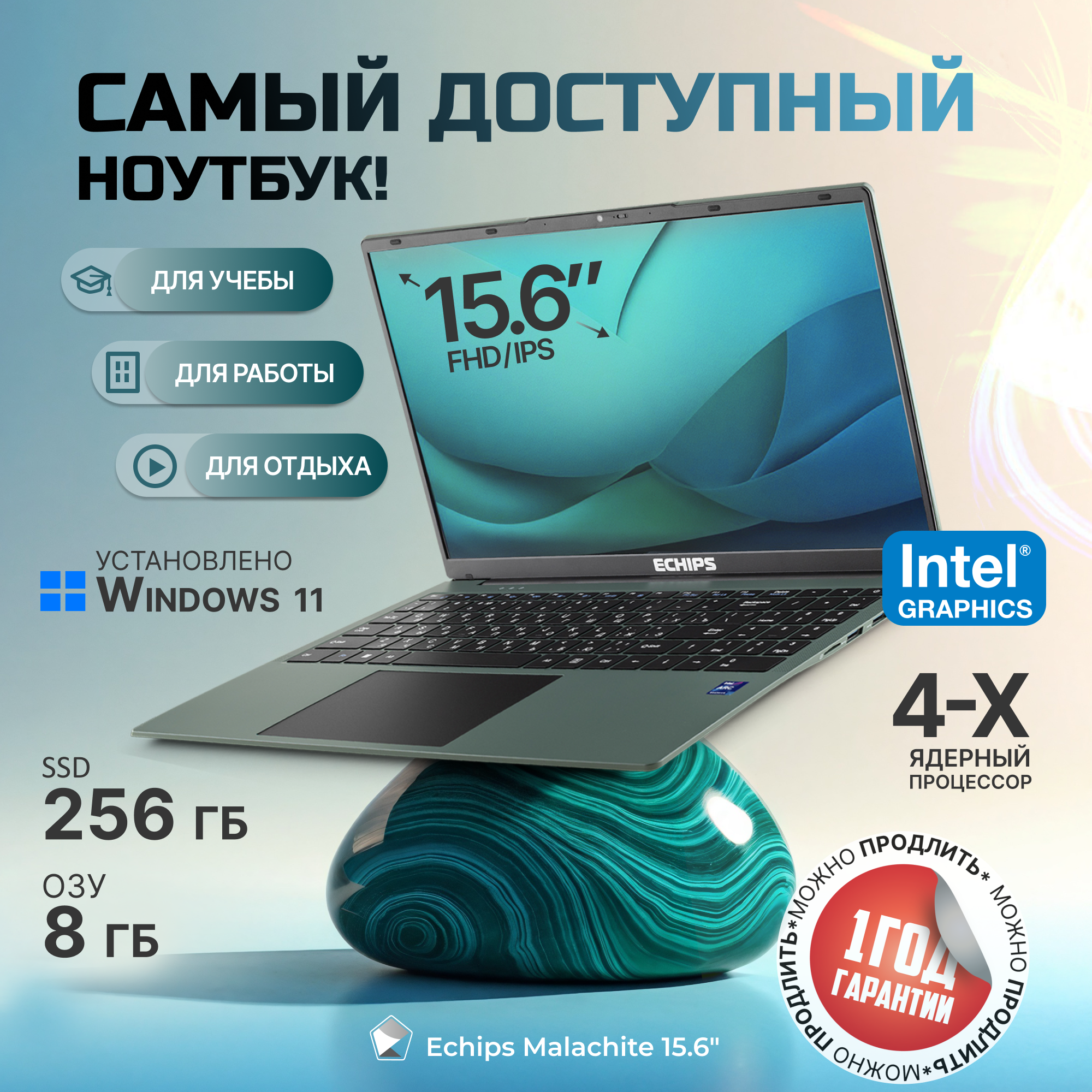 Купить Ноутбук для работы и учебы 15.6" Echips Malachite, Intel Processor N100, RAM 8 ГБ, SSD 256 ГБ, Intel UHD Graphics, Windows Home, зеленый, Русская раскладка