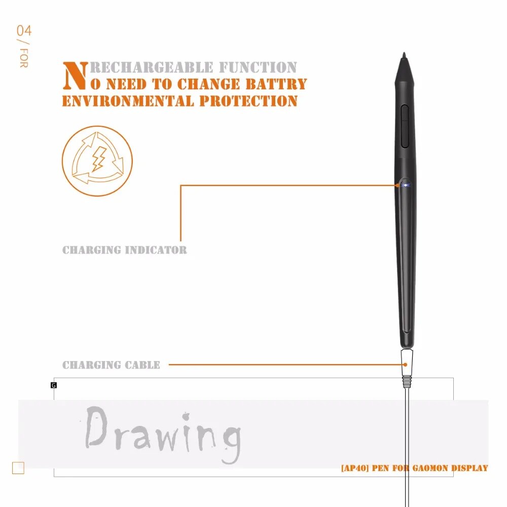 Перезаряжаемый стилус GAOMON ArtPaint AP40 для цифрового дисплея для рисования PD1560, Черный