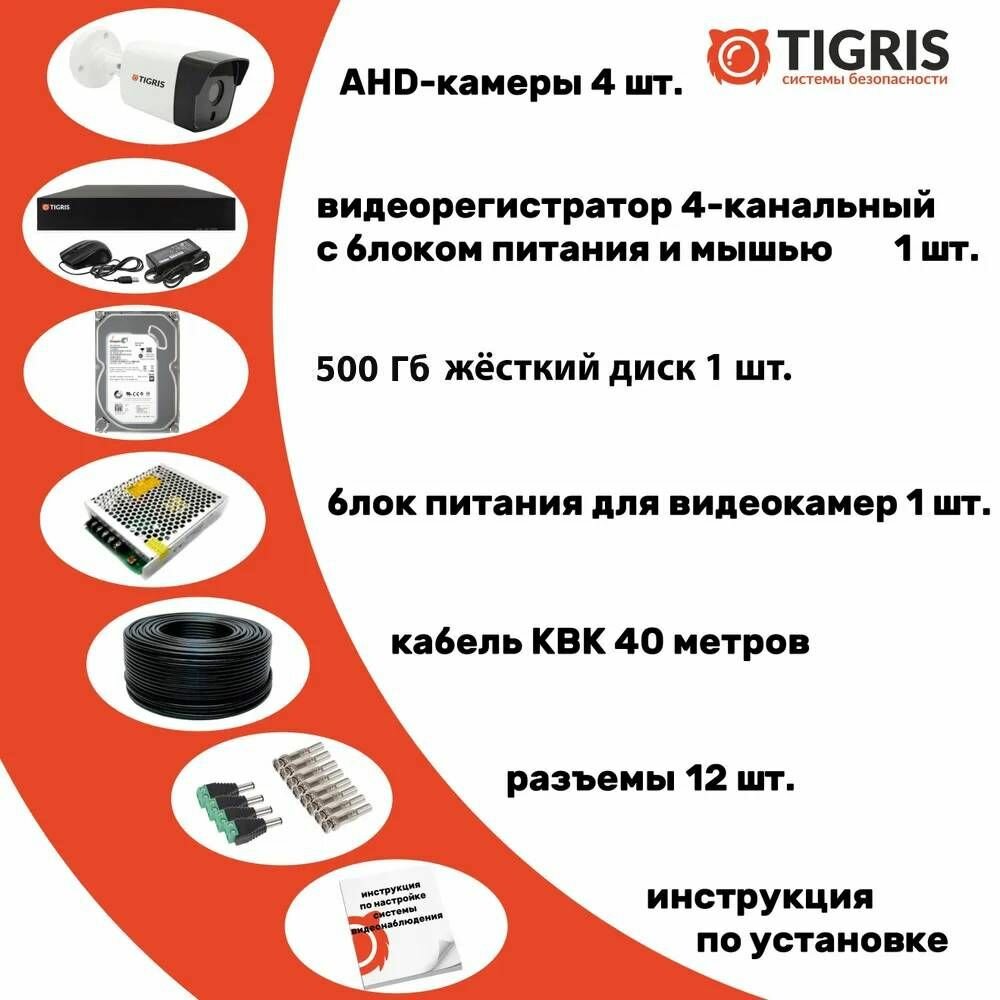 | Подробная комплектация | В комплект входит: 1. Видеорегистратор профессиональный, 4-канальный (блок питания и мышь для управления в комплекте)-1 шт. 2. Видеокамера уличная FULL HD- 4 шт. 3. Блок питания для видеокамер- 1 шт. 4. Кабель уличный, комбинированный (питание+видеосигнал)- 40 метров. 5. Комплект разъемов для подключения системы- 1 шт. 6. Инструкция по подключению системы- 1 шт. 7. Жесткий диск 1 Тб- 1 шт. |
