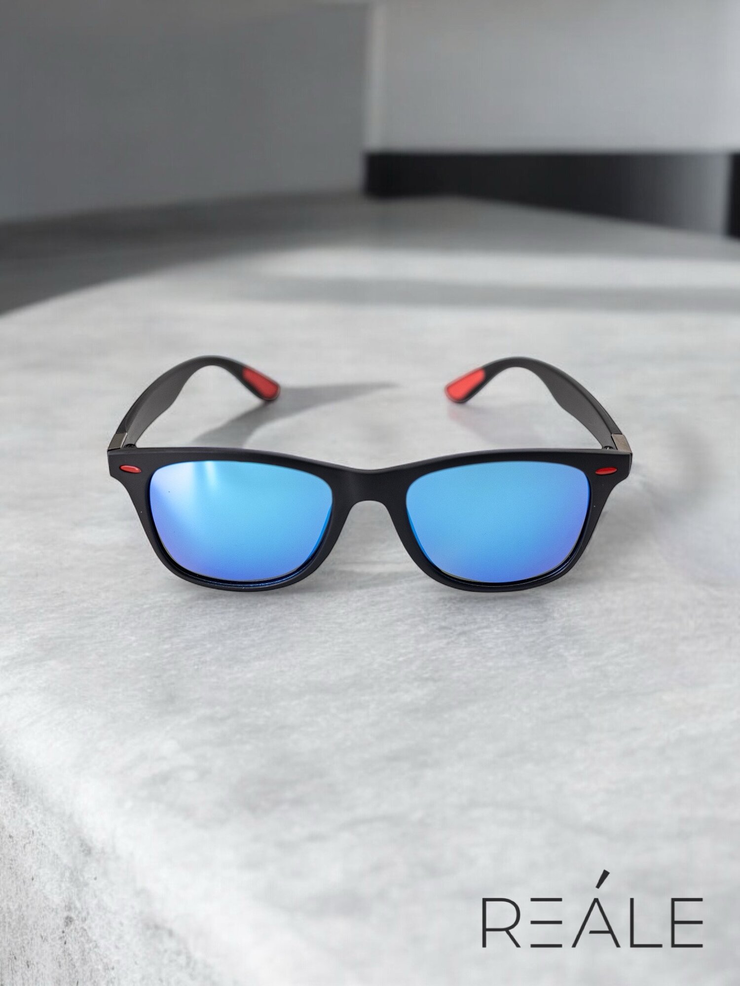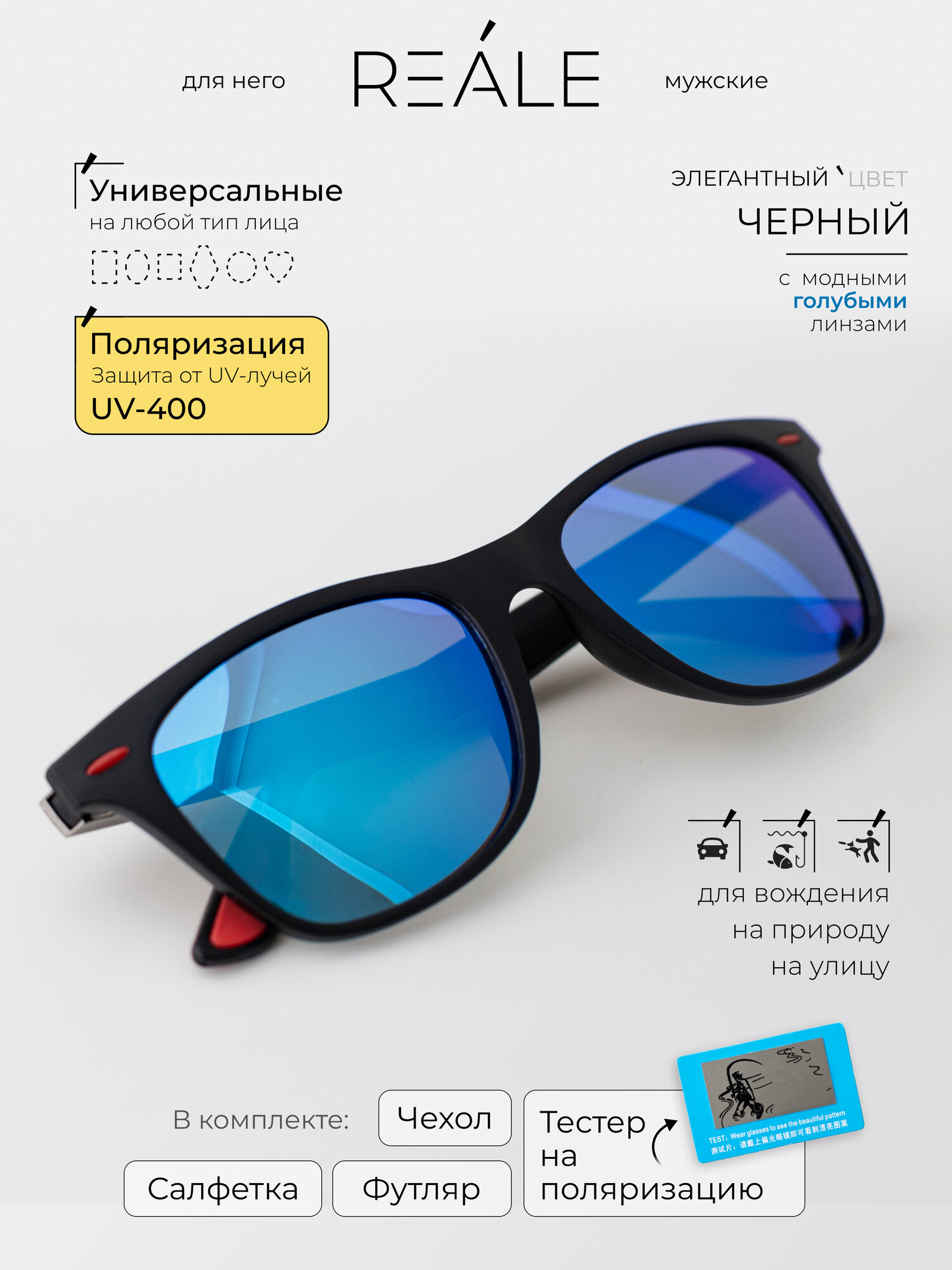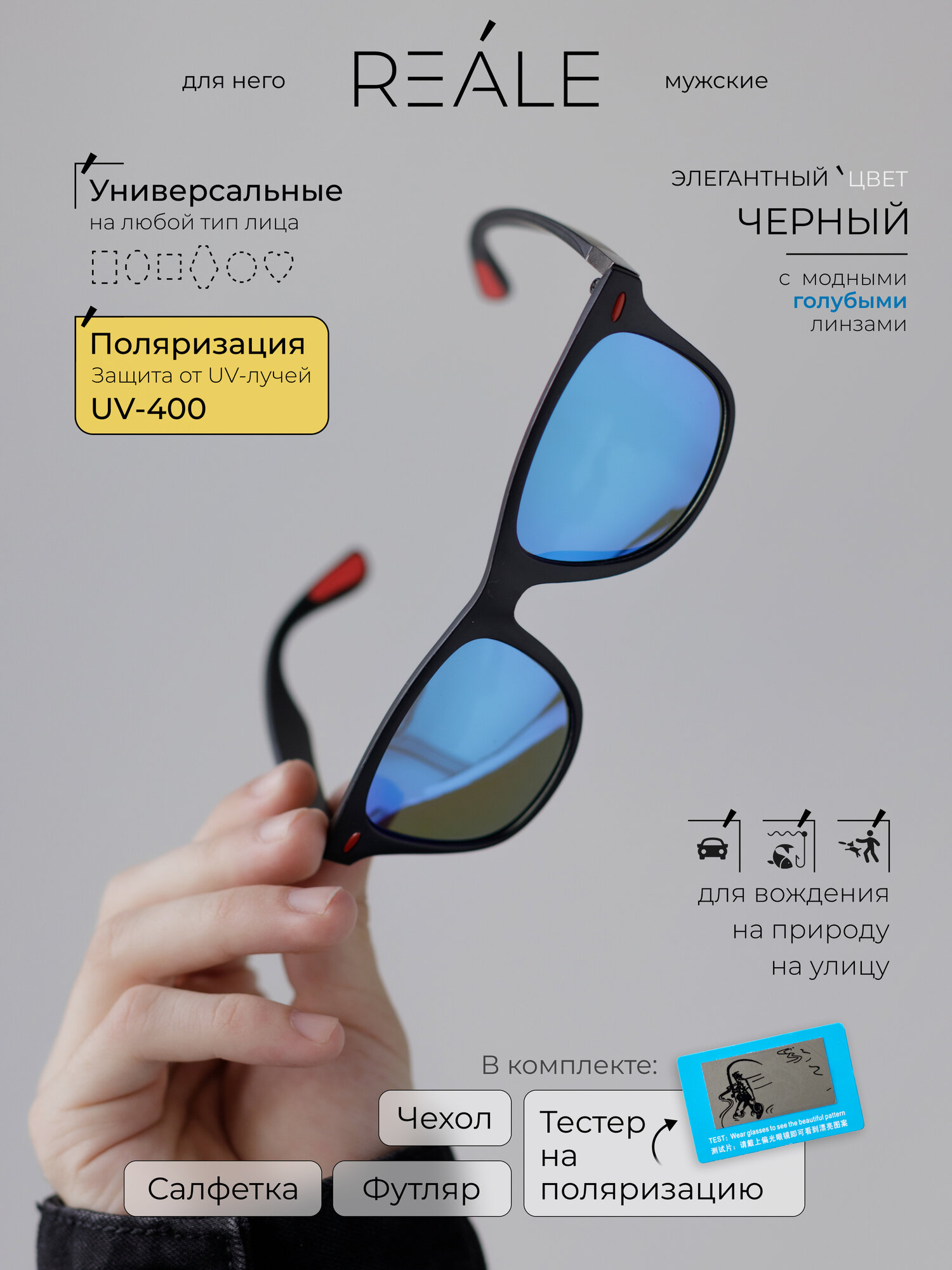 Очки солнцезащитные Wayfarer, поляризация и защита от ультрафиолета UV400, коллекция 2024, REALE, черные, синие