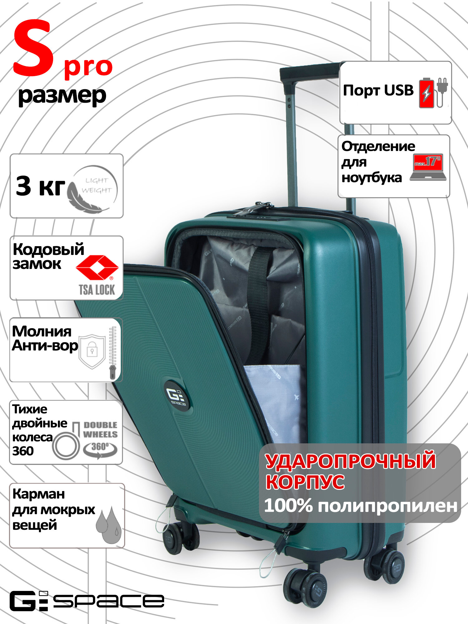 Маленький чемодан на колесиках GSPACE PRO, объем 36 литров, цвет темно-зеленый