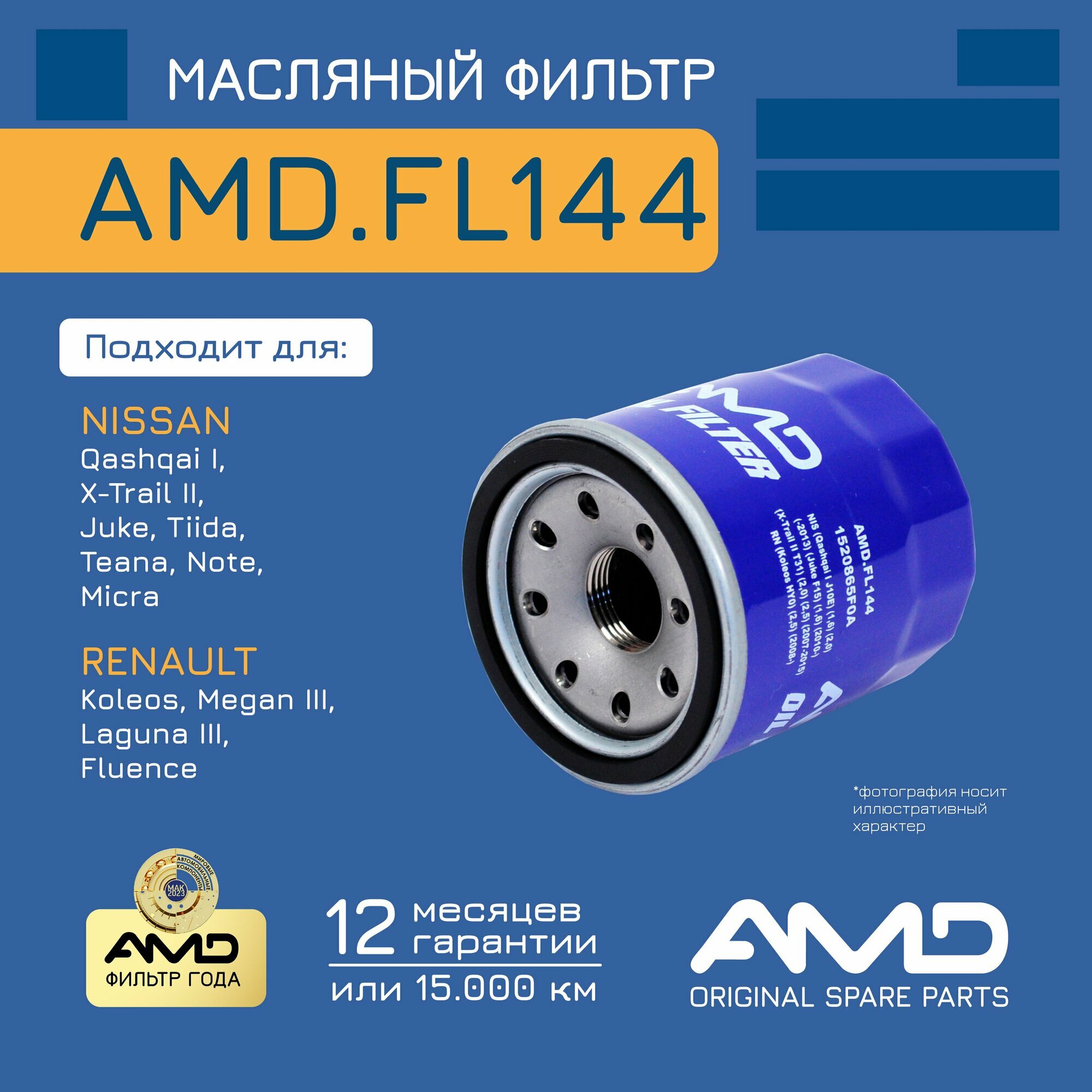 Фильтр масляный 1520865F0A AMD.FL144 для NISSAN Qashqai I J10E 1,6 2,0 -2013 Juke F15 1,6 2010- X-Trail II T31 2,0 2,5 2007-2015 RENAULT Koleos HY0 2,5 2008-