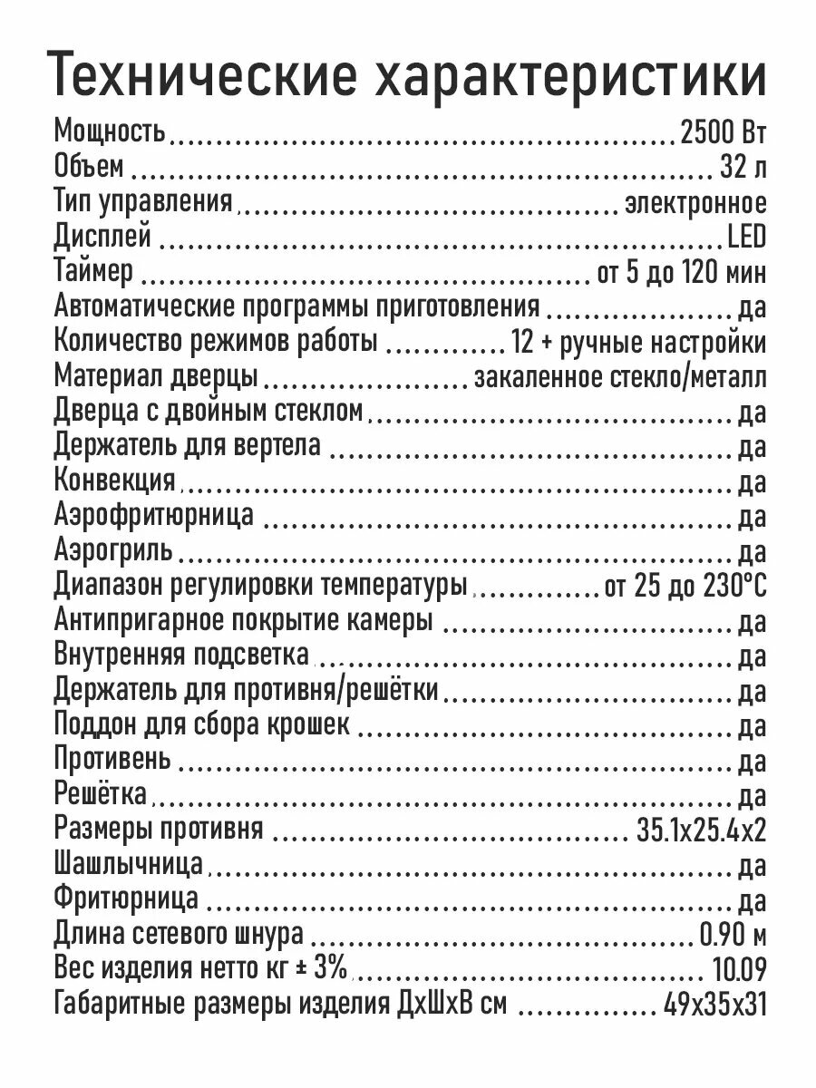 | Режимы | автоматические программы приготовления / конвекция |