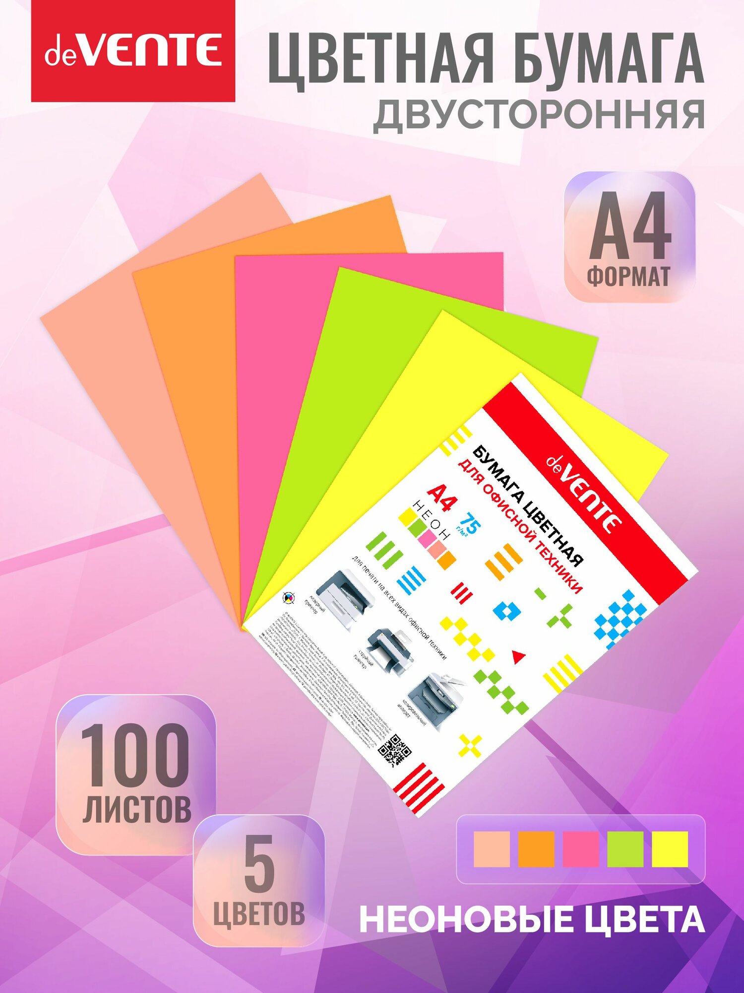 Бумага цветная неоновая для офисной техники A4 100 л, 75 г/м ассорти (5 цветов)