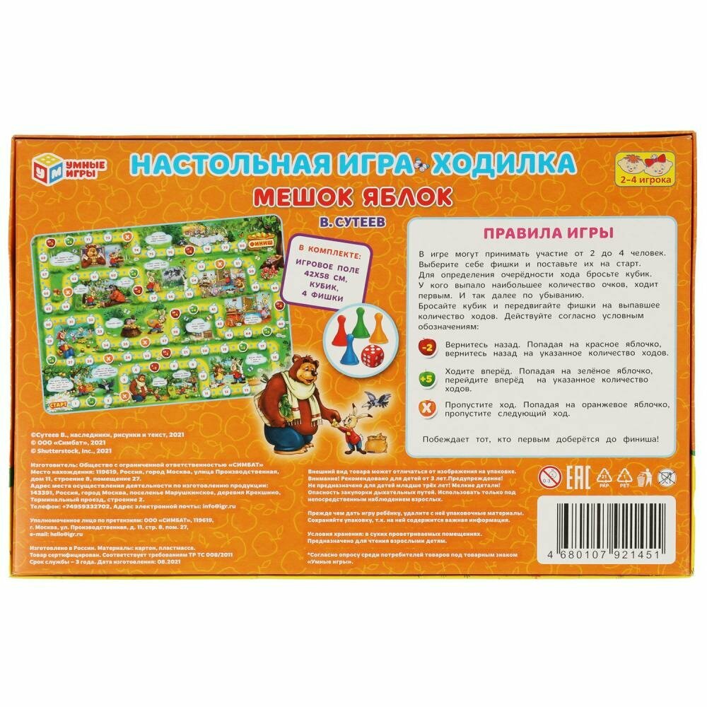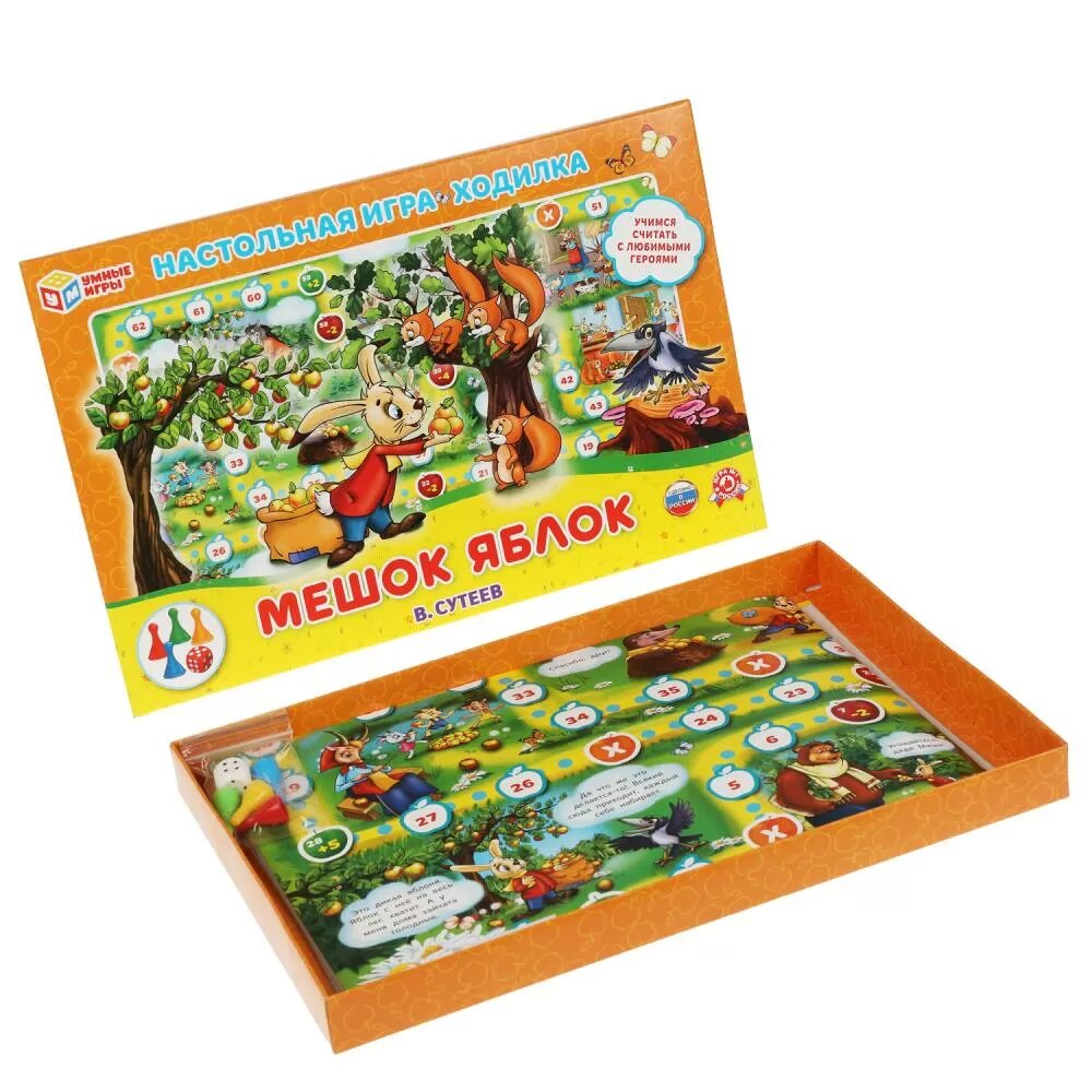 Настольная игра ходилка для детей Мешок яблок В. Сутеев, Умные игры, 2-4 игрока, для детей старше 3-х лет