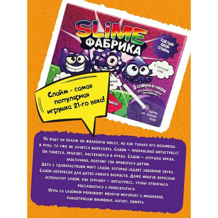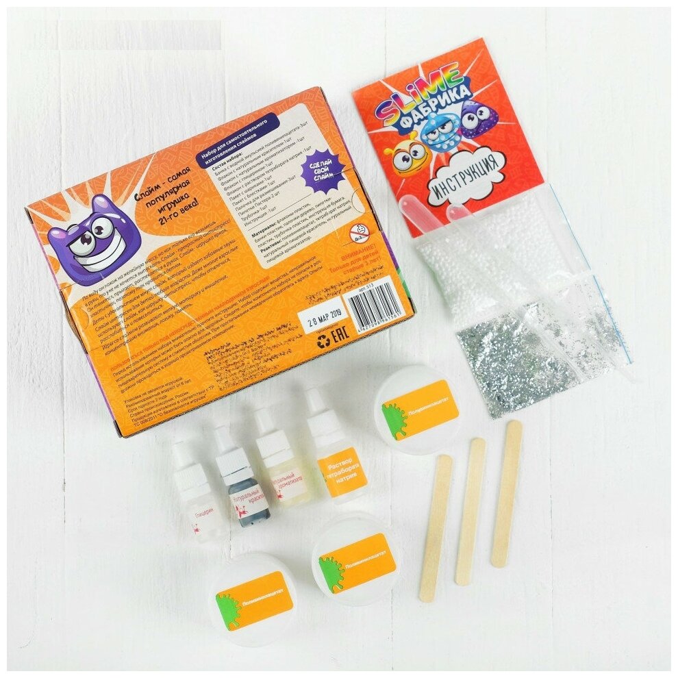 | Комплектация | баночка с водной эмульсией поливинилацетата, натуральный краситель, натуральный ароматизатор, глицерин, тетраборат натрия, шарики, блёстки, пипетка Пастера для удобства добавления ингредиентов, трубочка для выдувания, инструкция |