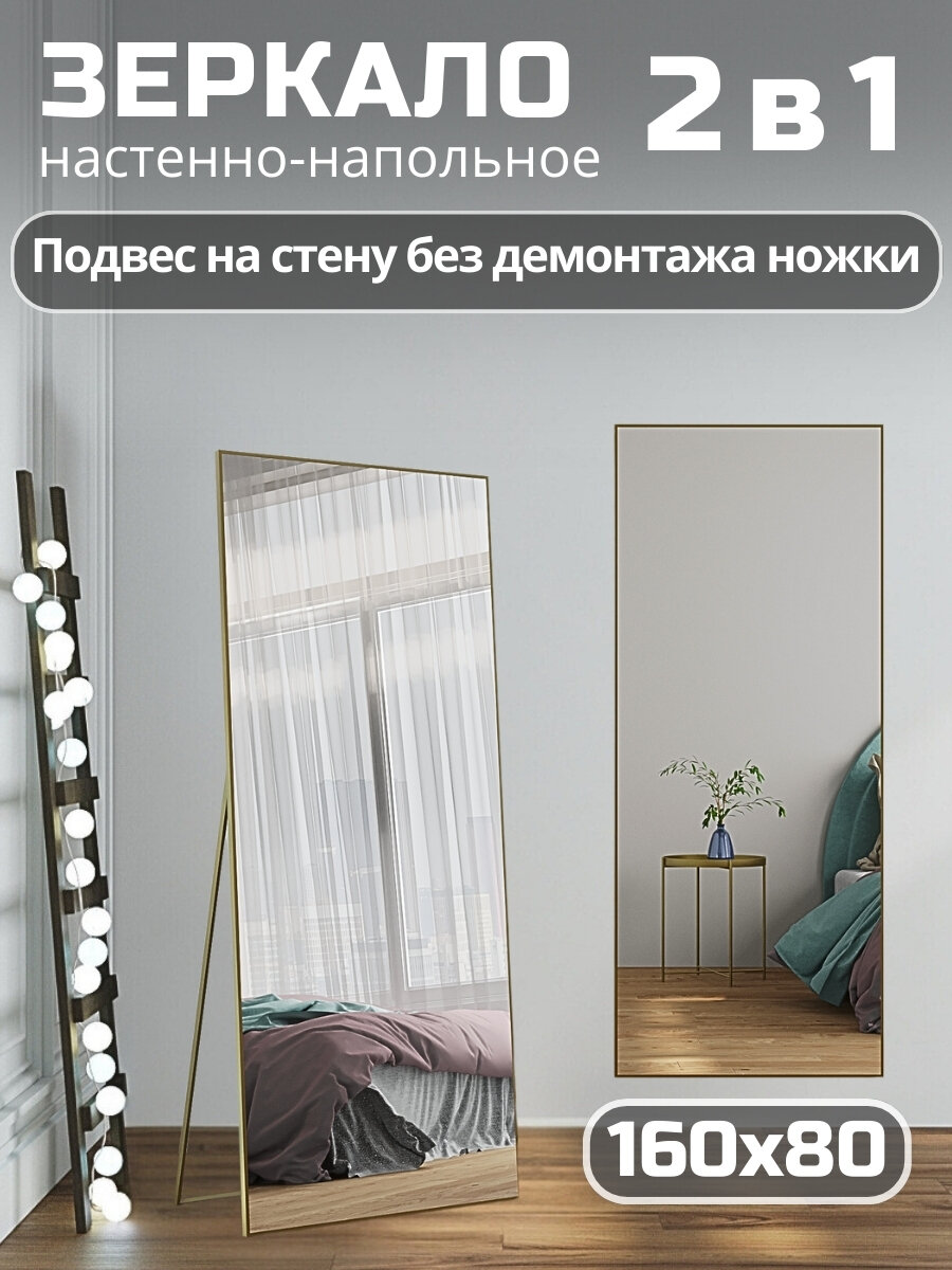 Зеркало напольное в полный рост 50х170 см матовое золото в алюминиевой раме на пол или на стену, большое зеркало