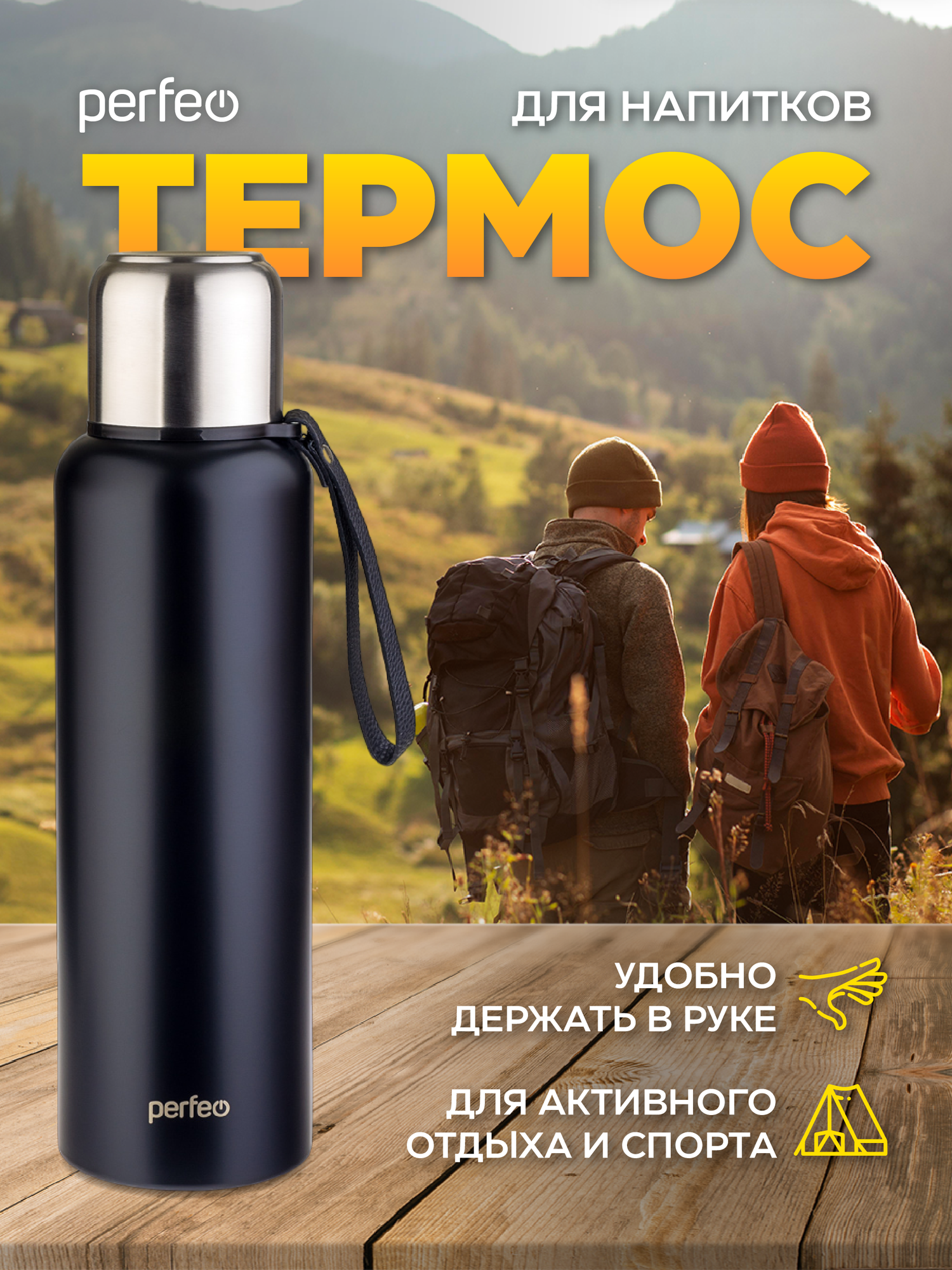 Термос PERFEO для напитков с глухой пробкой, ситечком, ремешком, объем 1 л, черный (PF_C3707)