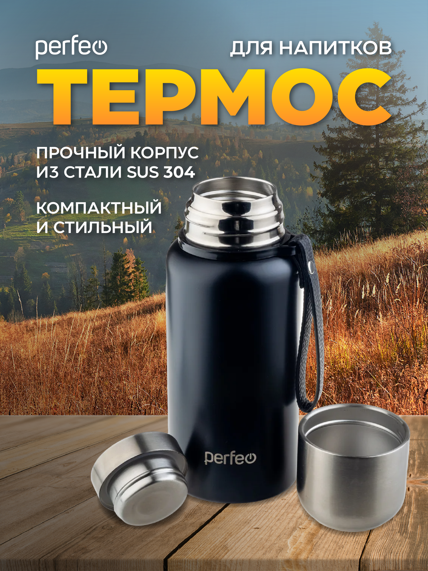 Термос PERFEO для напитков с глухой пробкой, ситечком, ремешком, объем 0,8 л, черный (PF_C3705)
