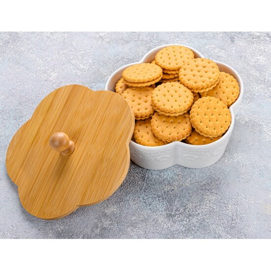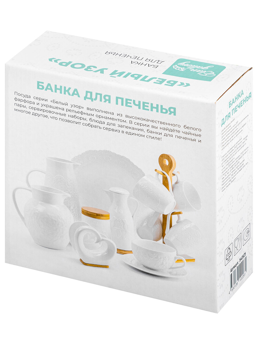 | Дополнительная информация | Банка фарфоровая для печенья круглая рельефная "Цветок Белый узор" 19,5х19,5х10 см, 900 мл, высота без крышки 6 см, с деревянной крышкой |
