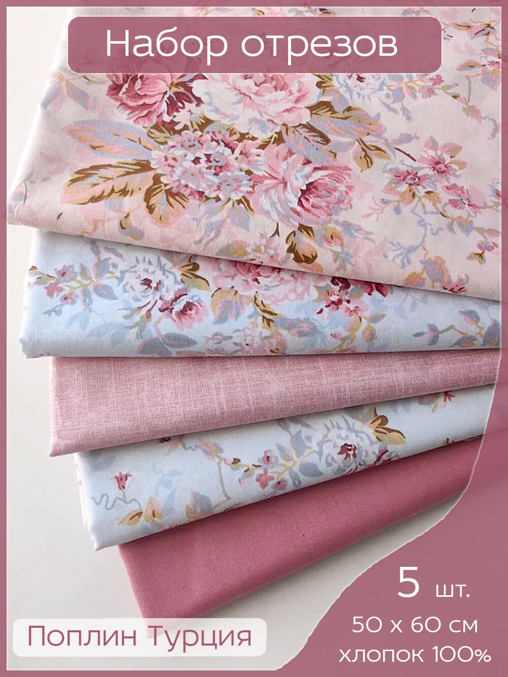 Ткань для шитья, рукоделия, 100% хлопок поплин Турция, набор тканей для пэчворка, розовый с розами в стиле прованс, 5 отрезов 50 х 60 см