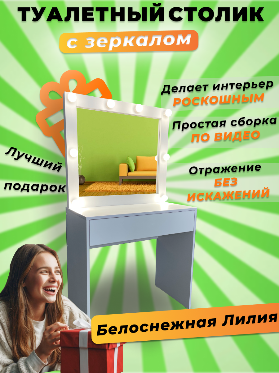 СохранитьТуалетный столик с зеркалом с подсветкой, с ящиком, 145х80 см, Микс-4, Цвет белый интересное: