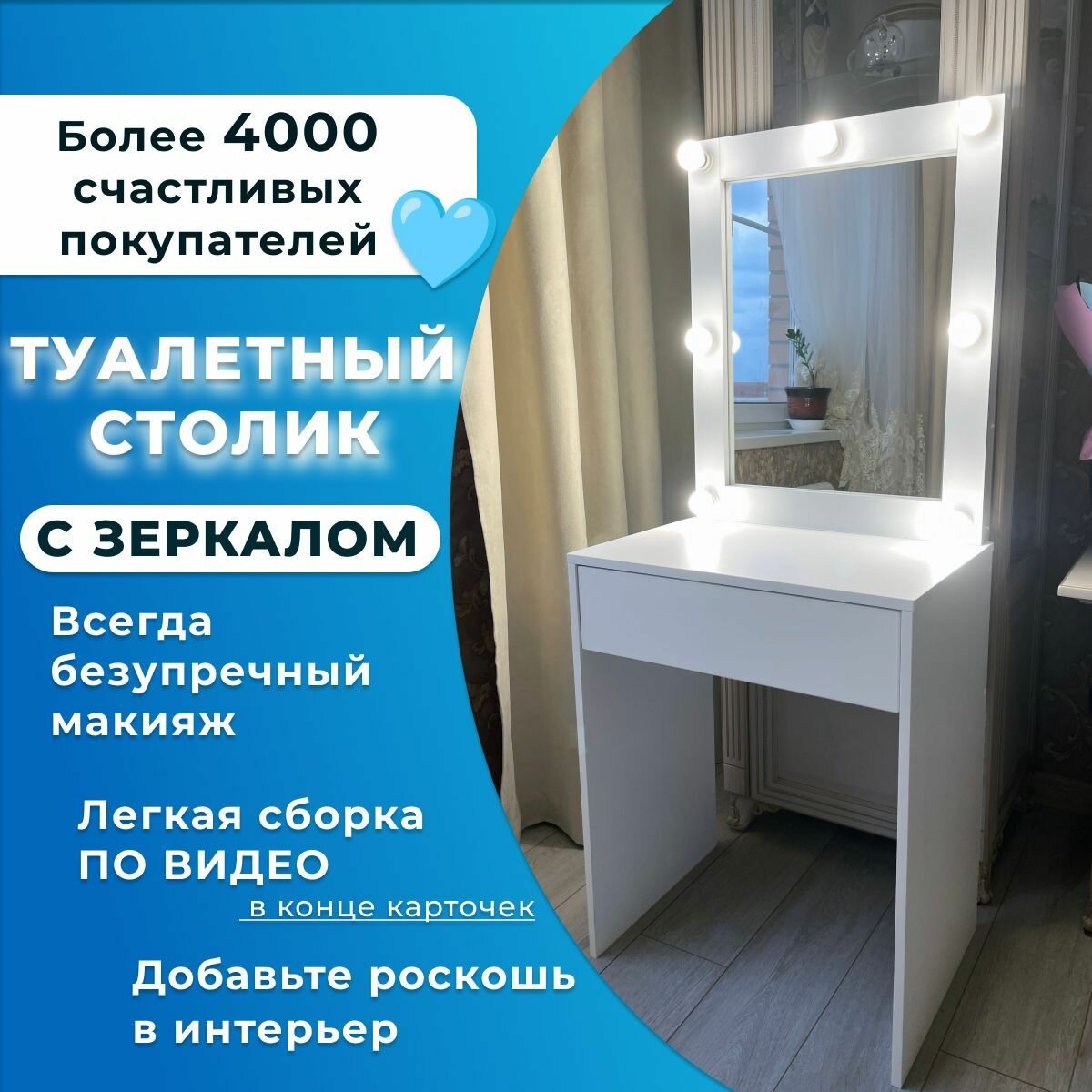Ниже Вы можете прочитать отзывы на Туалетный столик с зеркалом и подсветкой, с ящиком, 145х60 см, Микс-4, Цвет белый, ознакомится с подробными характеристиками, посмотреть интересные обзоры и фотографии на Туалетный столик с зеркалом и подсветкой, с ящиком, 145х60 см, Микс-4, Цвет белый.