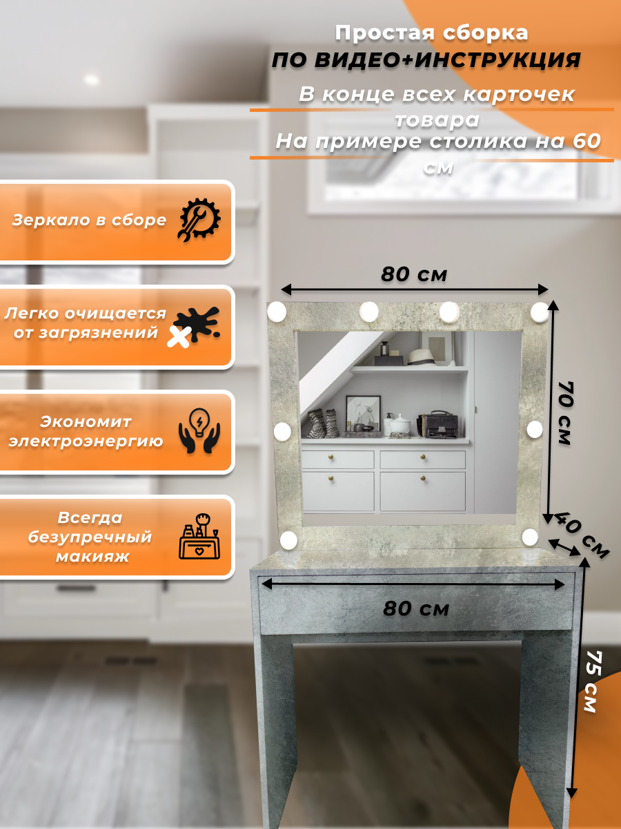 СохранитьТуалетный столик с зеркалом с подсветкой, с ящиком, 145х80 см, Микс-4, Цвет бетон интересное: