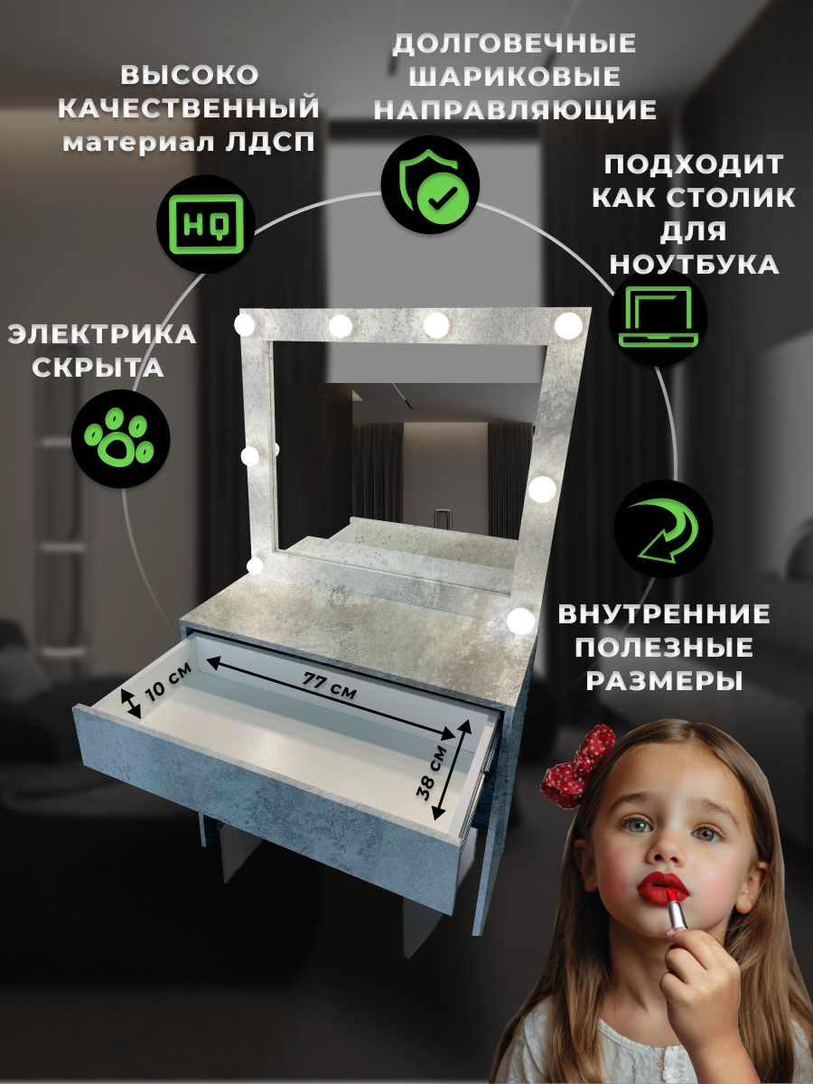 Туалетный столик с зеркалом и подсветкой, с ящиком, 145х60 см, Микс-4, Цвет бетон