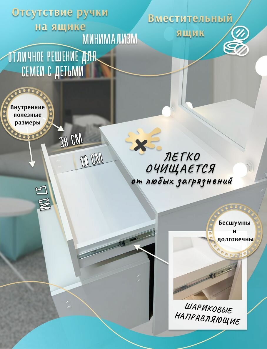 СохранитьТуалетный столик с зеркалом с подсветкой и пуфиком из экокожи, с ящиком, 145х60 см, Микс-3, Цвет белый интересное: