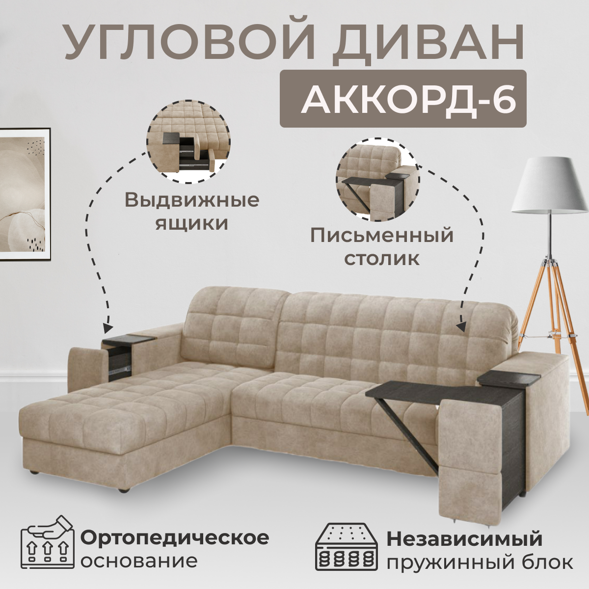 Угловой диван Аккорд-6, аккордеон на пружинном блоке, с журнальным столиком и ящиком для белья, металлокаркас, ортопедическое основание