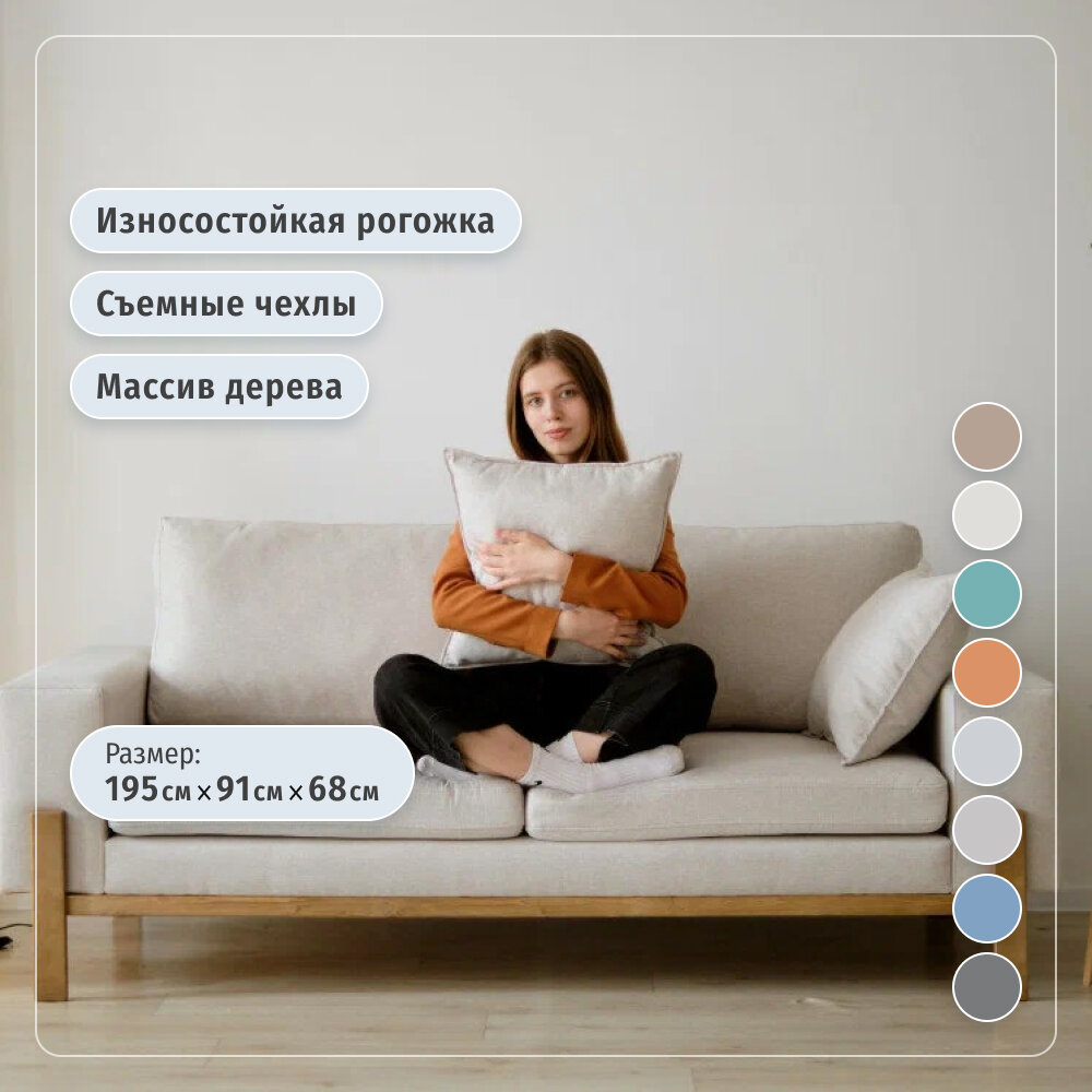 Прямой дизайнерский диван Soft Element Хангель, трехместный, массив дерева, рогожка, темно-бежевый, стиль скандинавский лофт, дачный