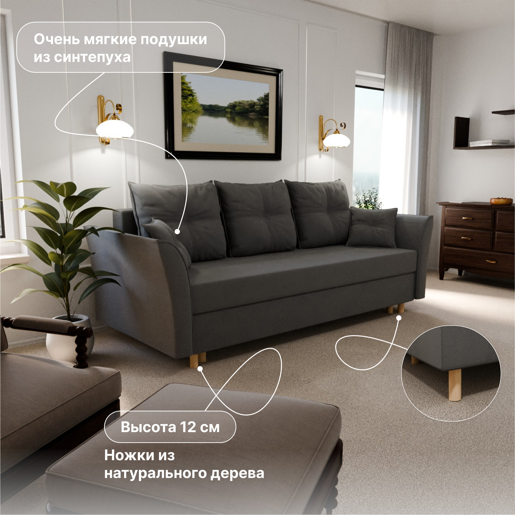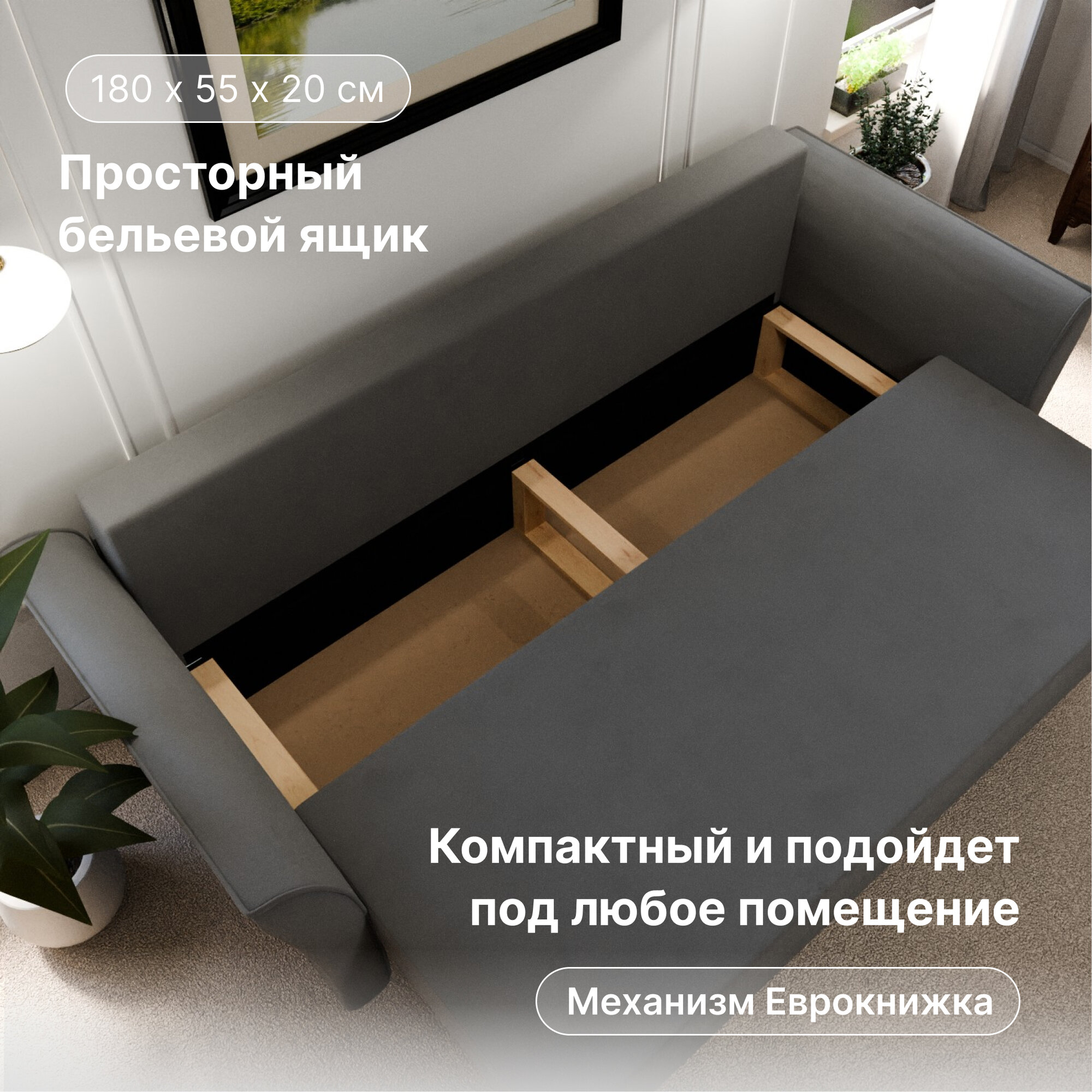 | Особенности | раскладная конструкция, с подлокотниками, съемные подушки, ящик для белья |