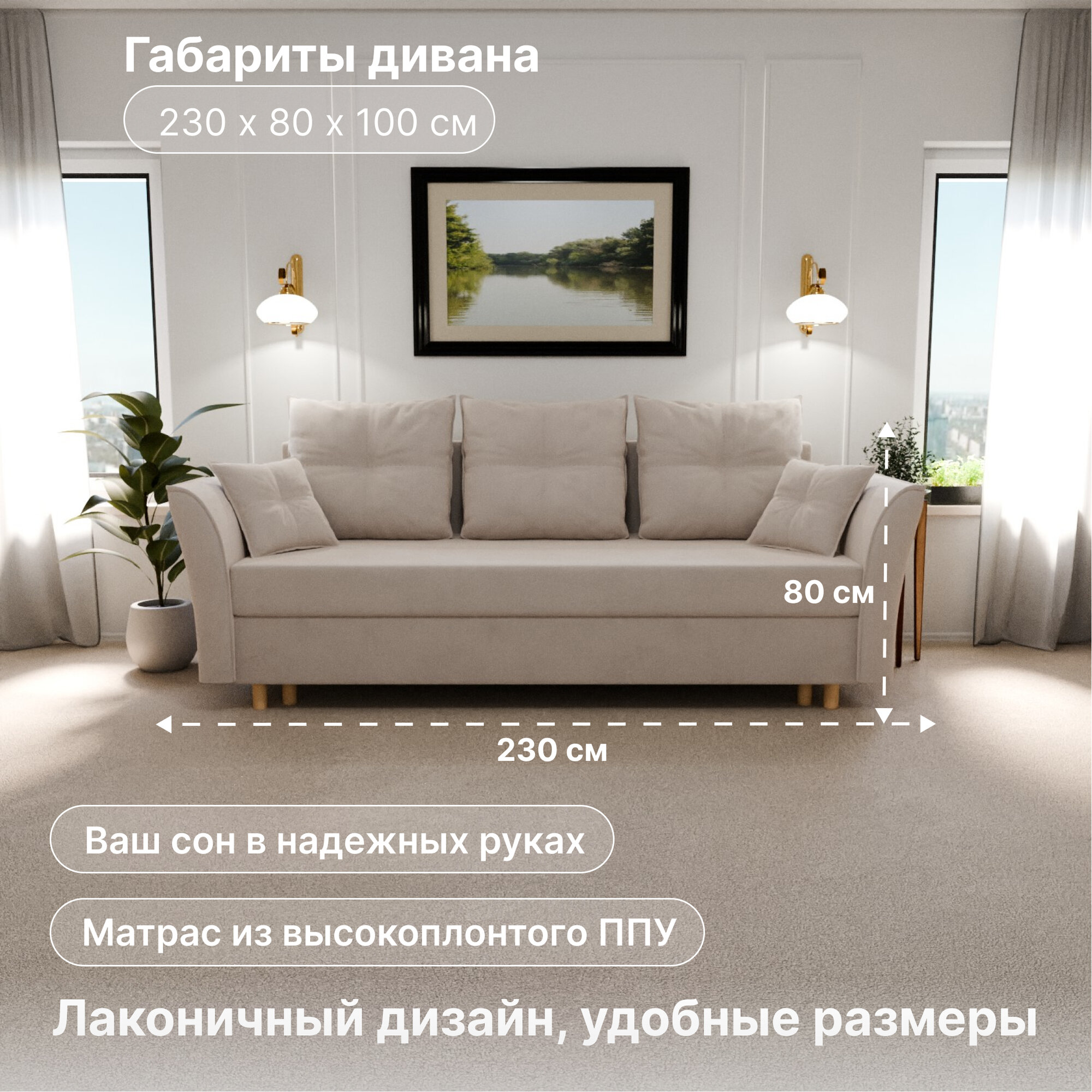 Диван, диван-кровать, диван раскладной "Пандора" ППУ, Велютта люкс 07, размеры 230х80х100, бежевый