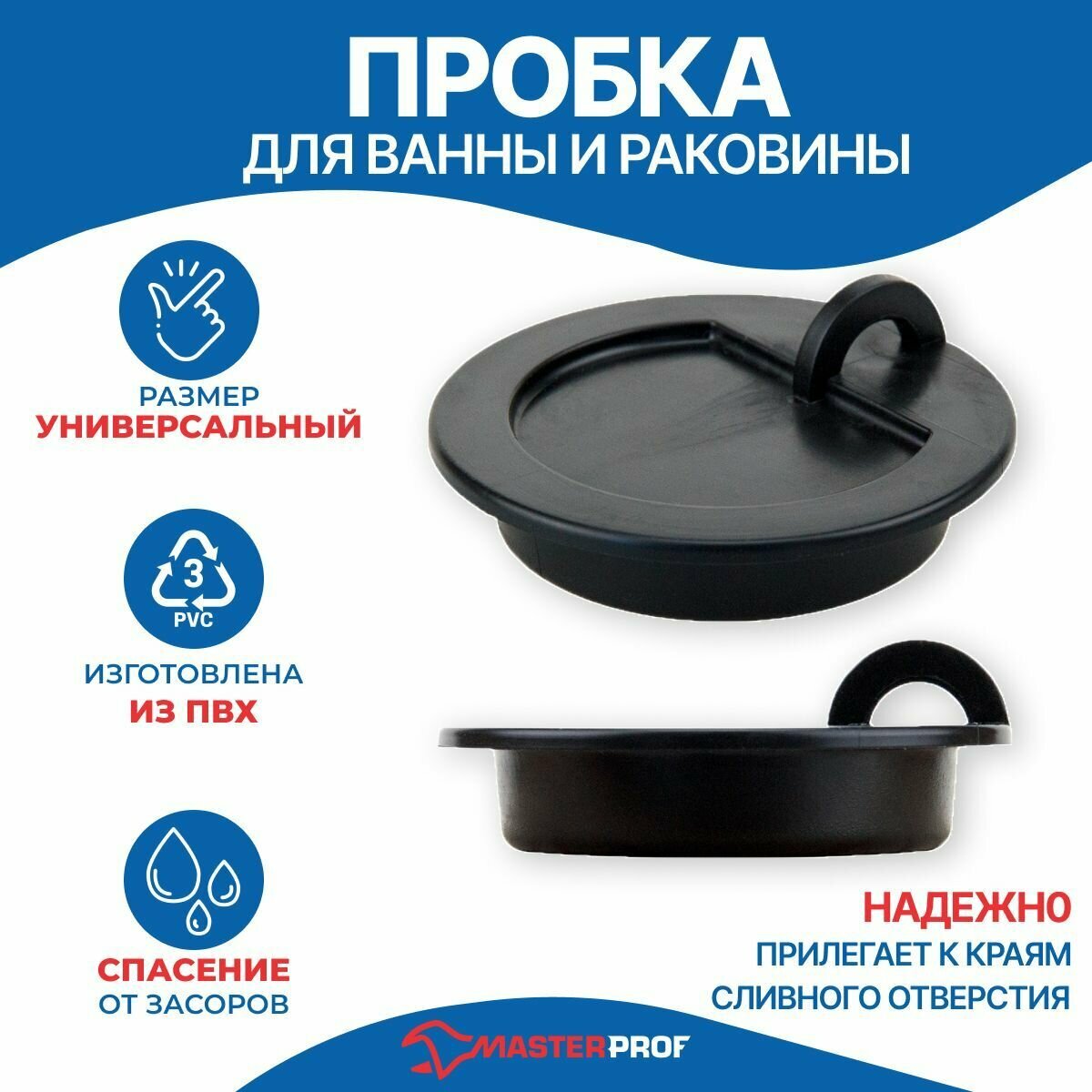 Пробка для ванны MasterProf, резина, 5.6 см, черная