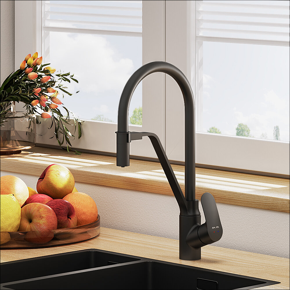 Смеситель для кухни AM.PM Chic, с гибким изливом, с каналом для питьевой воды, латунь, черный, 2 в 1 управ.одной ручкой