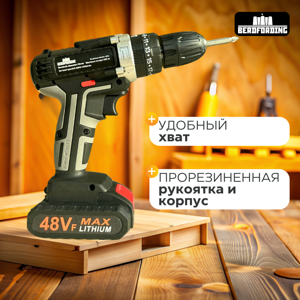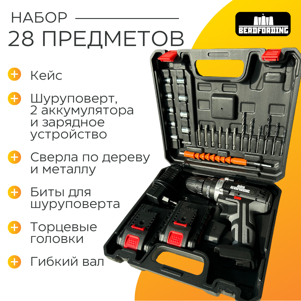 Дрель-шуруповерт аккумуляторный BERDFORDING, бесщеточный, 2 АКБ li-lion, 48V, кейс с 28 предметами