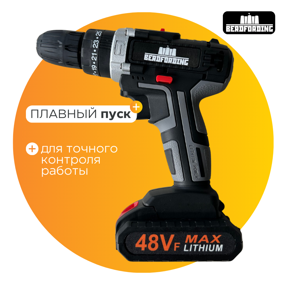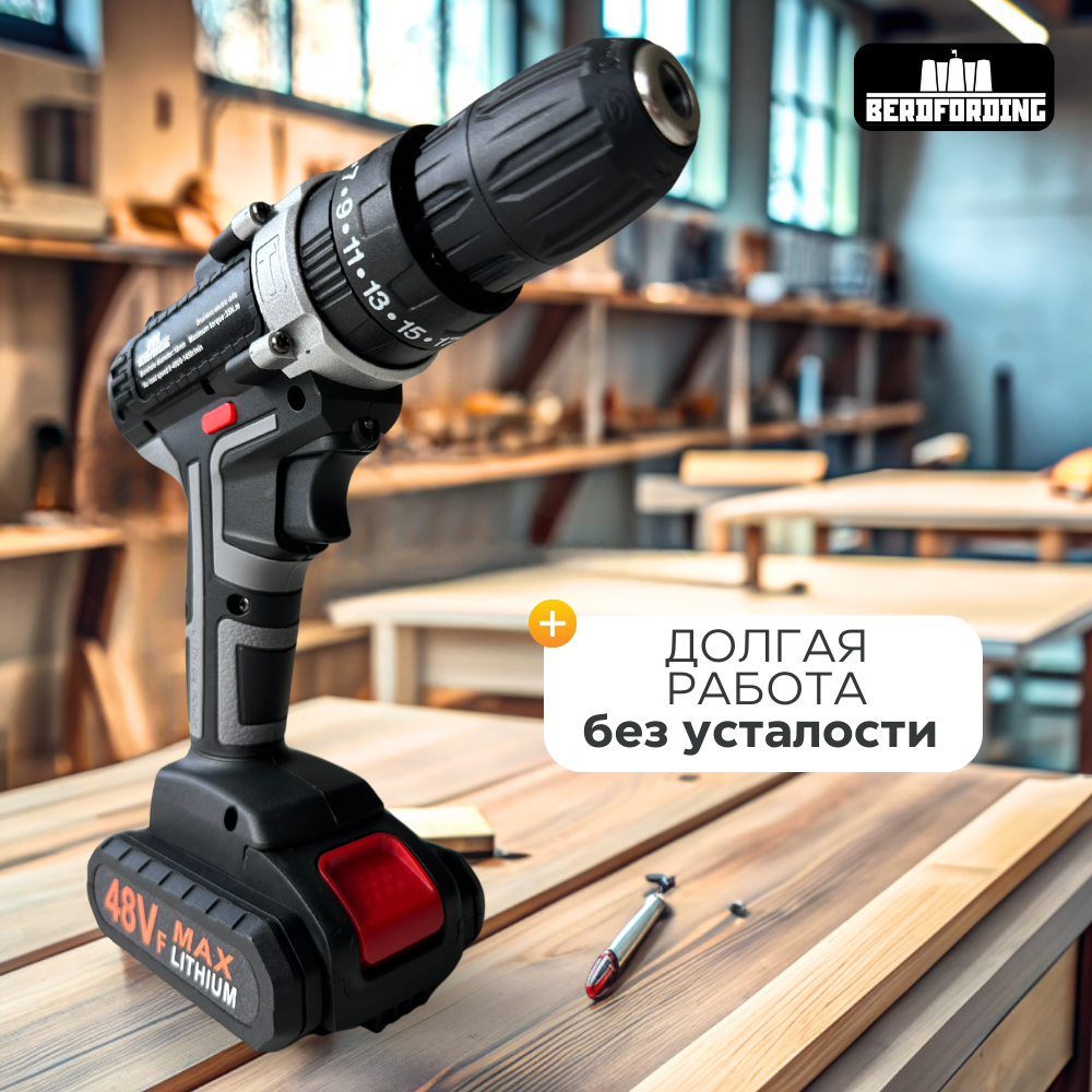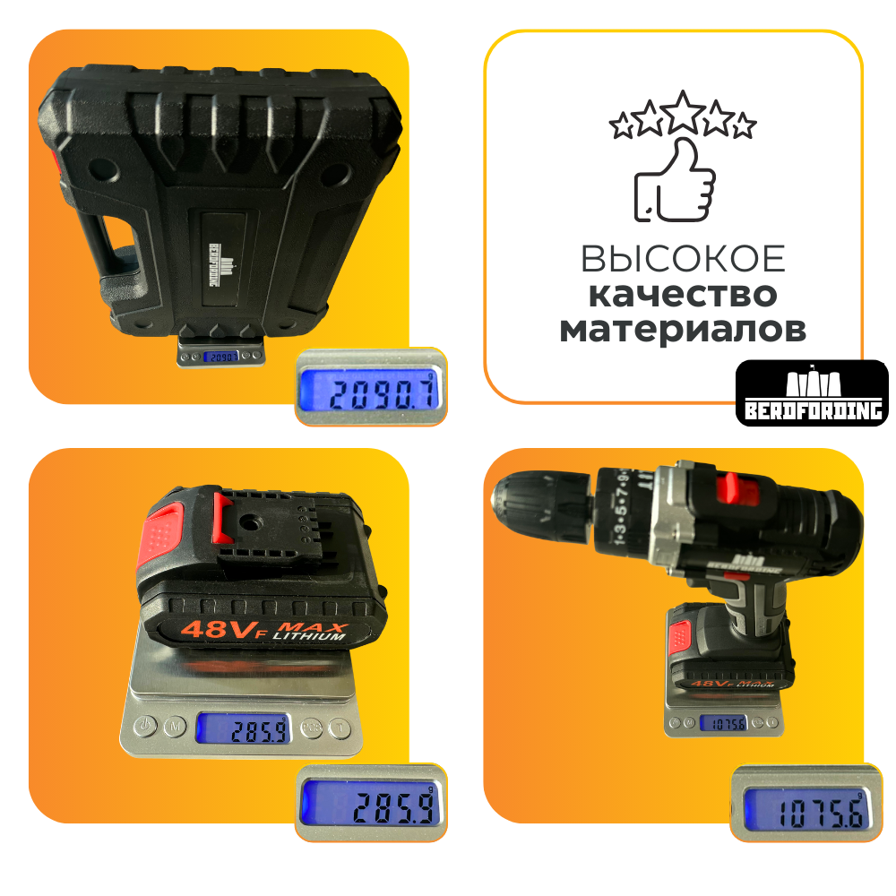 Дрель-шуруповерт аккумуляторный BERDFORDING, 2 АКБ li-lion, 48V, кейс с 28 предметами интересное: