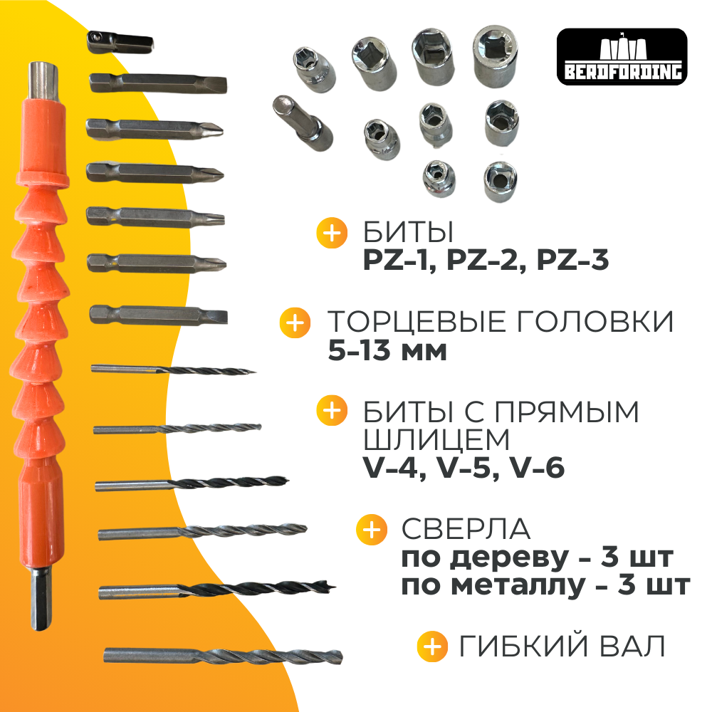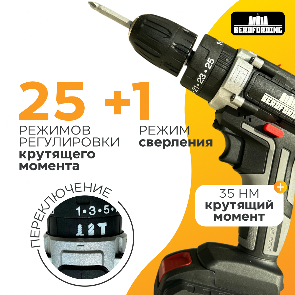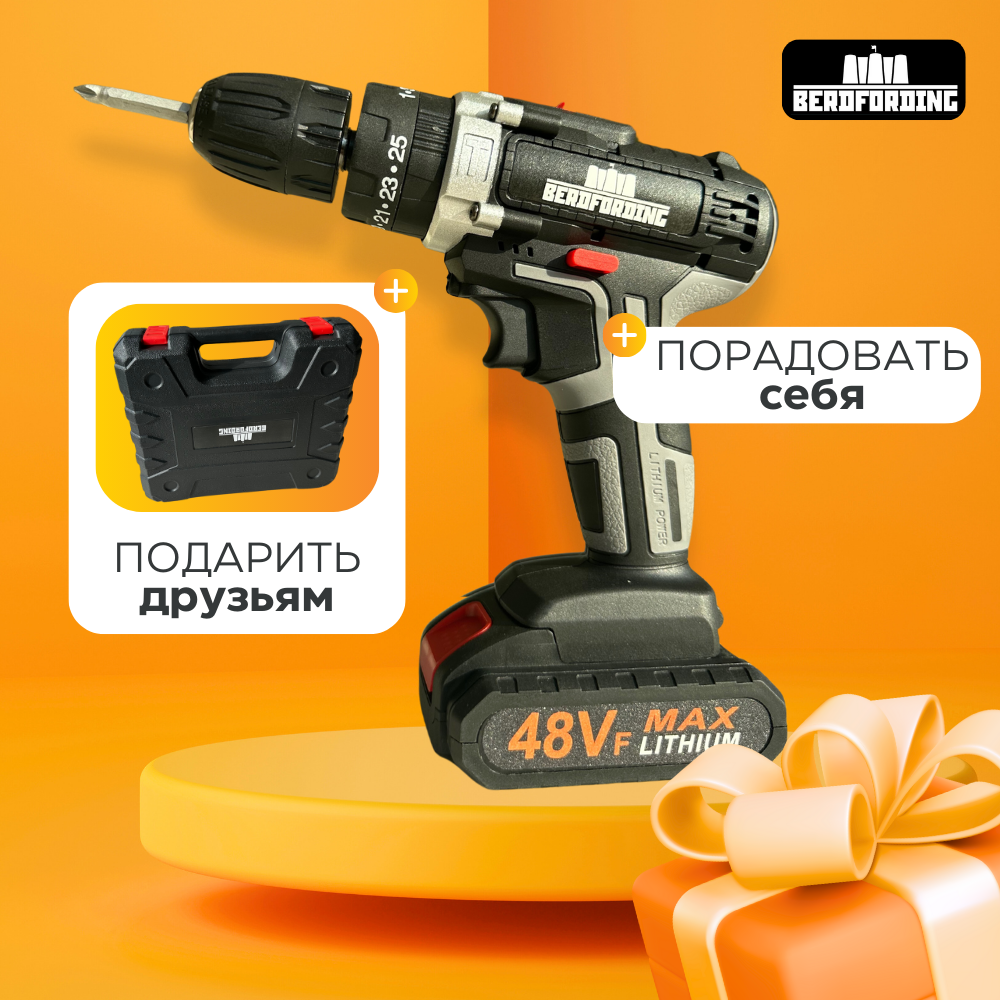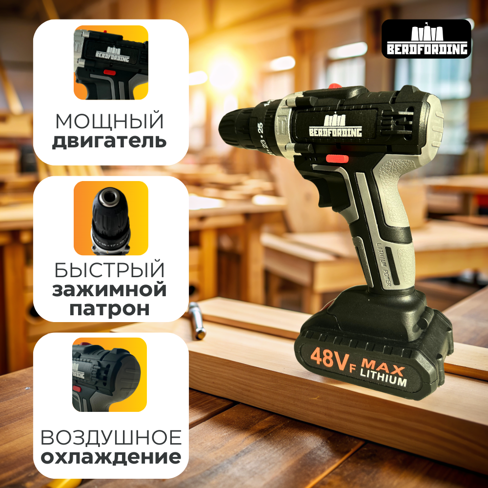 Дрель-шуруповерт аккумуляторный BERDFORDING, 2 АКБ li-lion, 48V, кейс с 28 предметами интересное: