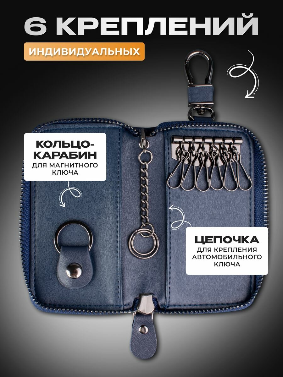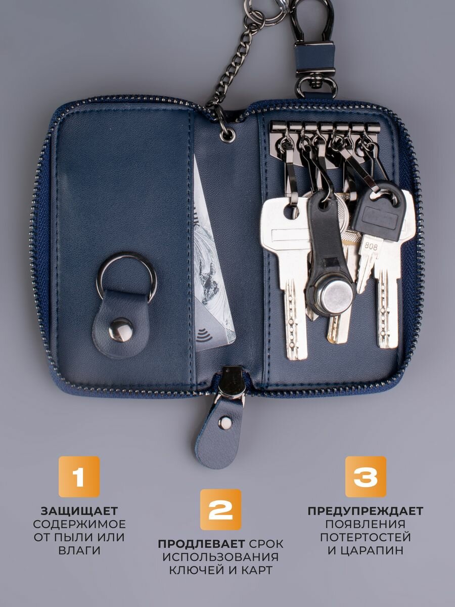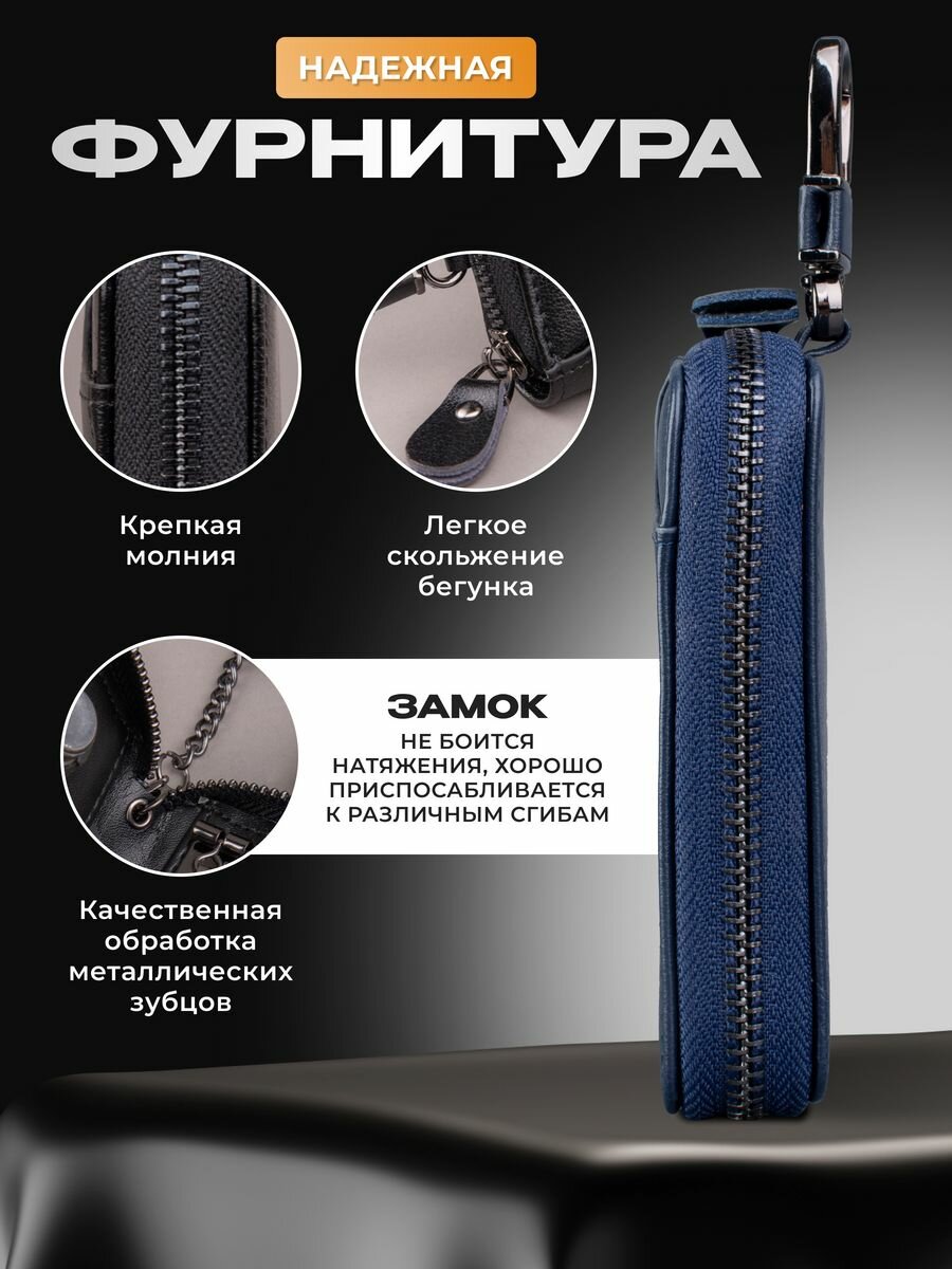 Ключница из натуральной кожи, 2 отделения на молнии, карабин, синий