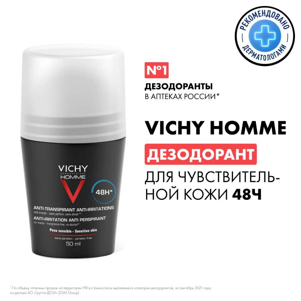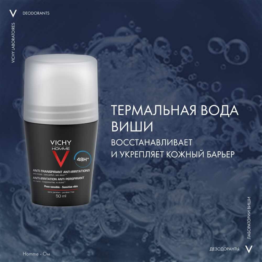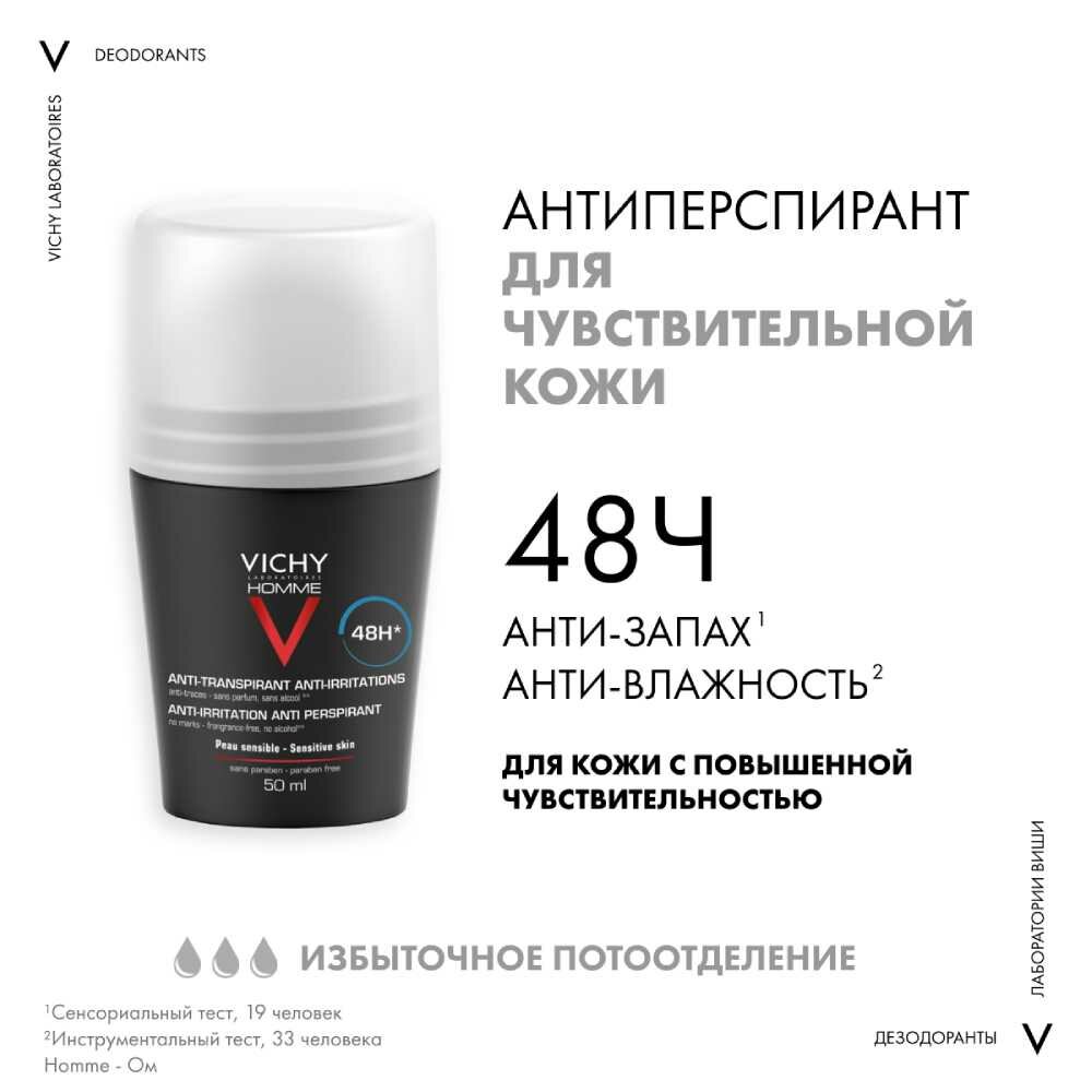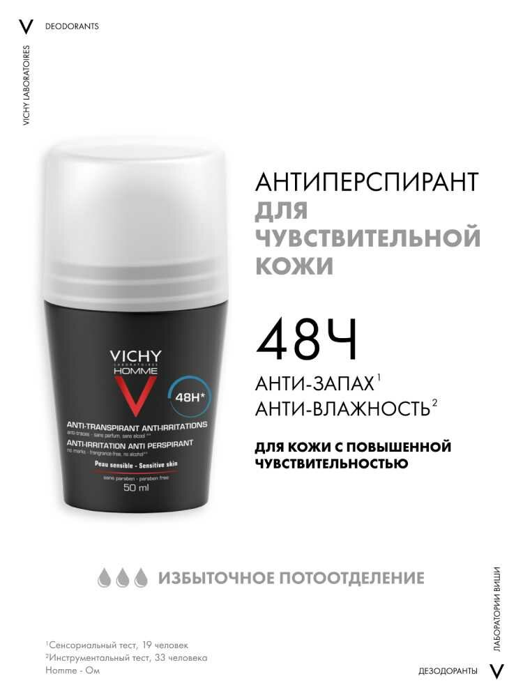 Дезодорант-антиперспирант шариковый Vichy Homme для чувствительной кожи 48 часов, 50 мл