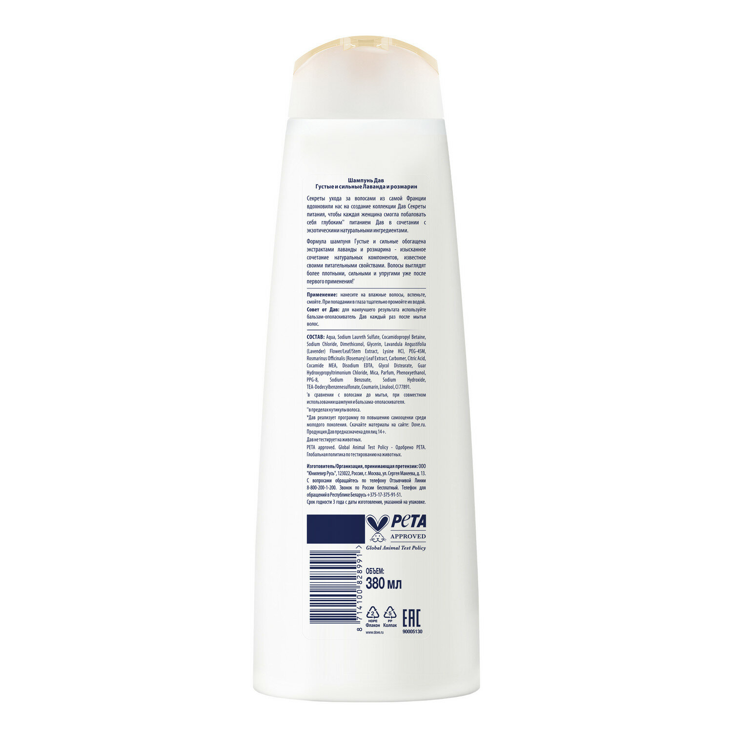 | Состав | aqua, sodium laureth sulfate, sodium chloride, cocamidopropyl betaine, dimethiconol, glycerin, guar hydroxypropyltrimonium chloride, lavandula angustifolia (lavender) flower/leaf/stem extract, lavandula angustifolia (lavender) oil, lysine hcl, rosmarinus officinalis (rosemary) leaf extract, carbomer, citric acid, cocamide mea, disodium EDTA, glycol distearate, mica, parfum, PEG-45M, phenoxyethanol, PPG-9, propylene glycol, silica, sodium benzoate, sodium hydroxide, tea-dodecylbenzenesulfonate, tea-sulfate, titanium dioxide, alpha-isomethyl ionone, coumarin, linalool |
