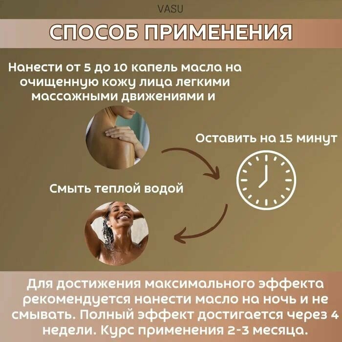 | Способ применения | нагрейте немного масла в руках, нанесите его на лицо или проблемную зону, аккуратно сделайте массаж. Оставьте масло для воздействия на 10-20 минут, смойте теплой водой. Для лечения его используют 2-3 раза в день в течение недели, затем можно перейти к использованию 1 раз в день |