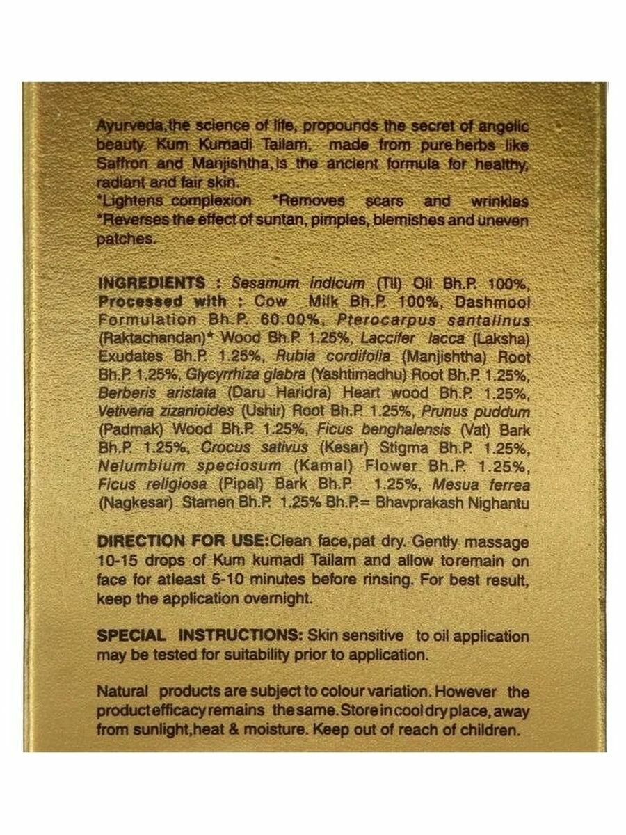 | Состав | кунжутное масло, шеллак, шафран, фикус бенгальский, дизоксилум малабарский, лакричник, саппановое дерево, монохория влагалищная, коровье молоко, марена сердцелистная, ветивер, лотос комарова |