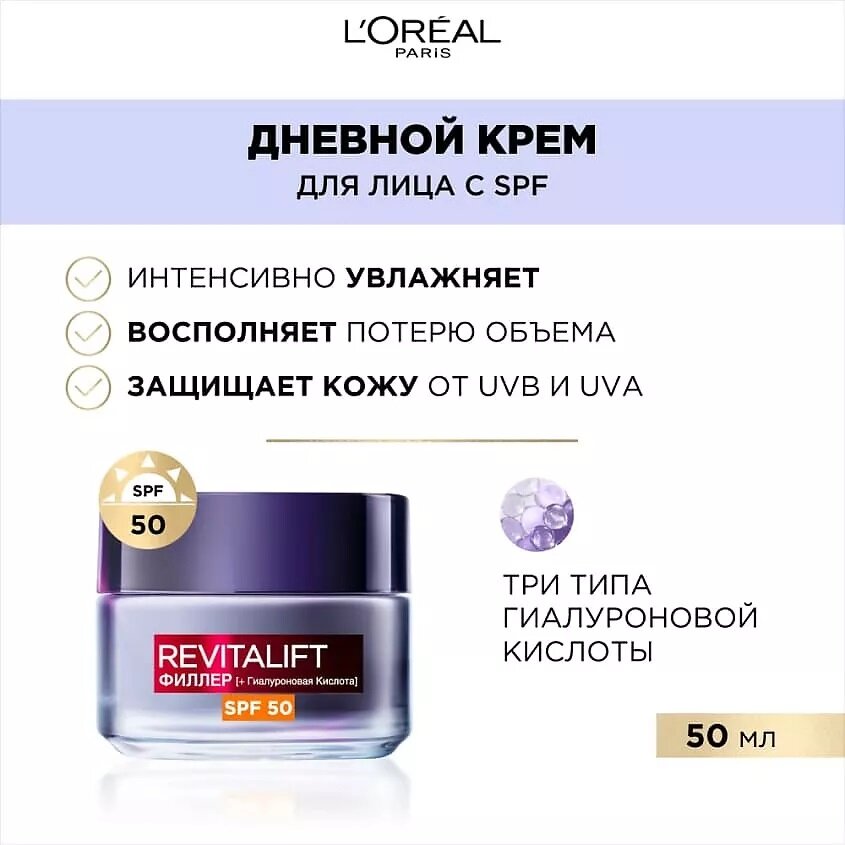 L'Oreal Paris Дневной антивозрастной крем Ревиталифт Филлер [ha] против морщин c SPF 50, 50 мл