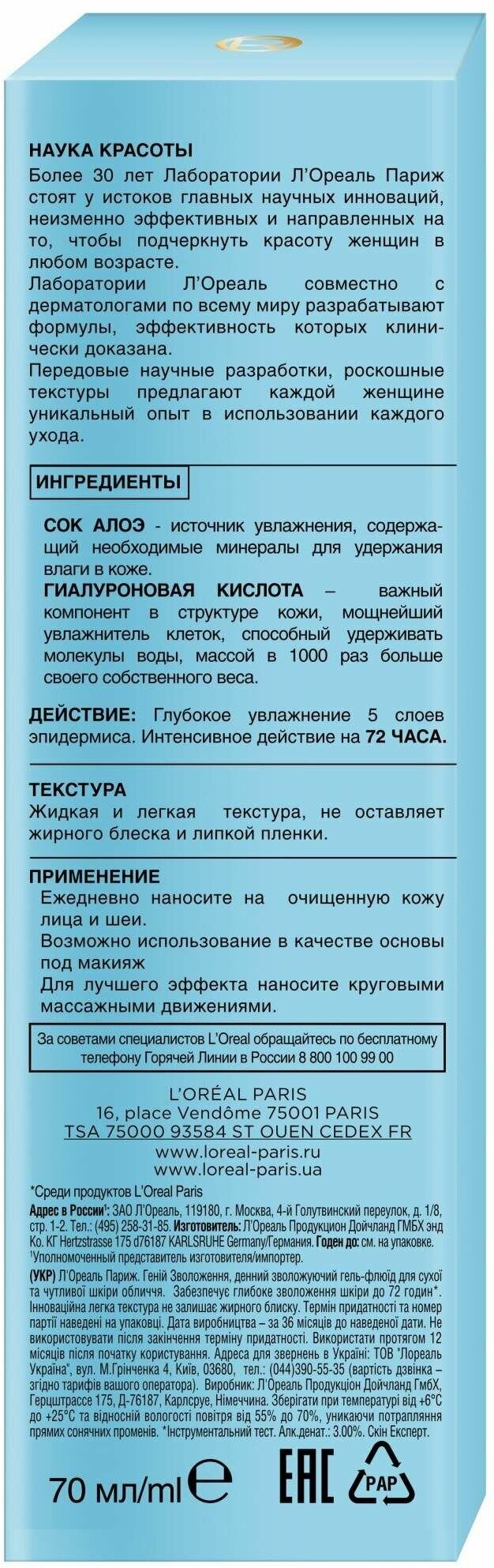 Купить L'Oreal Paris аква-флюид для лица Гений увлажнения для сухой и чувствительной кожи, 70 мл