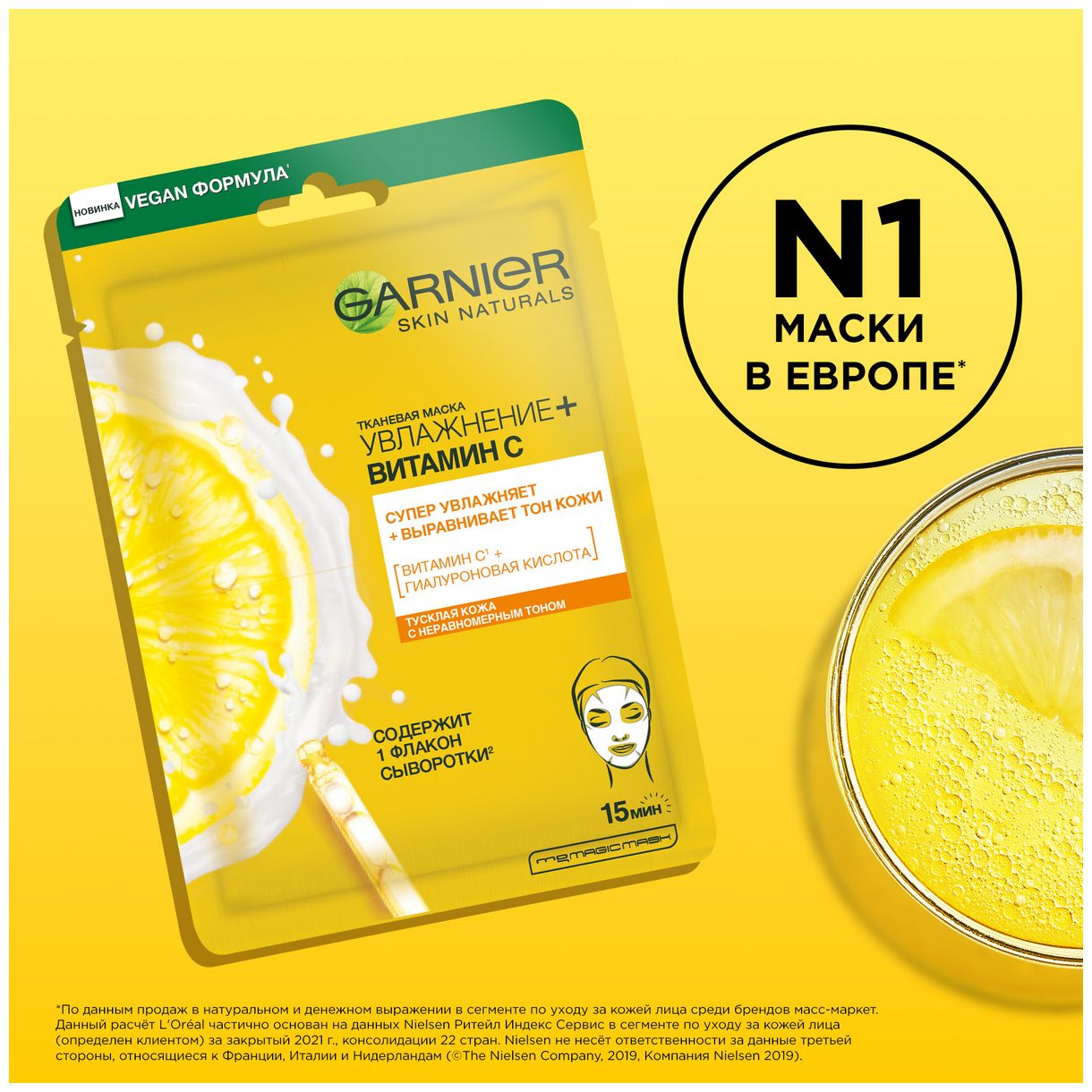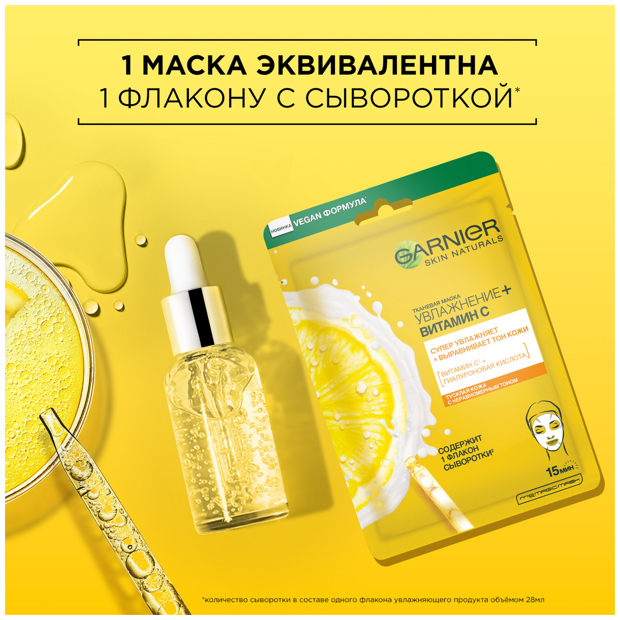 Garnier Тканевая маска для лица "Увлажнение+Витамин С" увлажняет и выравнивает тон кожи, 23 г
