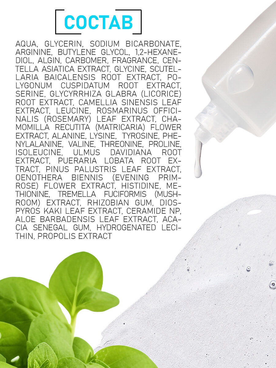 | Состав | WATER, GLYCERIN, SODIUM BICARBONATE, TRIETHANOLAMINE, BUTYLENE GLYCOL, 1,2-HEXANEDIOL, ALGIN, CARBOMER, FRAGRANCE, CENTELLA ASIATICA EXTRACT, GLYCINE, SCUTELLARIA BAICALENSIS ROOT EXTRACT, POLYGONUM CUSPIDATUM ROOT EXTRACT, SERINE, GLYCYRRHIZA GLABRA (LICORICE) ROOT EXTRACT, CAMELLIA SINENSIS LEAF EXTRACT, LEUCINE, ROSMARINUS OFFICINALIS (ROSEMARY) LEAF EXTRACT, CHAMOMILLA RECUTITA (MATRICARIA) FLOWER EXTRACT, ALANINE, LYSINE, ARGININE, TYROSINE, PHENYLALANINE, VALINE, THREONINE, PROLINE, ISOLEUCINE, ULMUS DAVIDIANA ROOT EXTRACT, PUERARIA LOBATA ROOT EXTRACT, PINUS PALUSTRIS LEAF EXTRACT, OENOTHERA BIENNIS (EVENING PRIMROSE) FLOWER EXTRACT, HISTIDINE, METHIONINE, TREMELLA FUCIFORMIS (MUSHROOM) EXTRACT, RHIZOBIAN GUM, DIOSPYROS KAKI LEAF EXTRACT, CERAMIDE NP, ALOE BARBADENSIS LEAF EXTRACT, ACACIA SENEGAL GUM, HYDROGENATED LECITHIN, PROPOLIS EXTRACT |