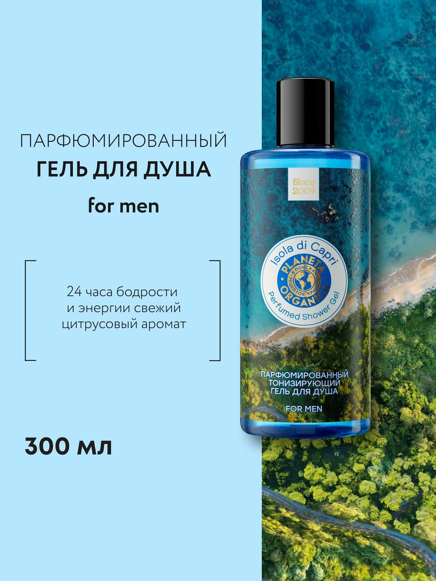 Купить Planeta Organica MEN Isola di Capri Гель для душа мужской парфюмированный тонизирующий, цитрусовый древесный аромат с бергамотом, сандалом и амброй 300 мл