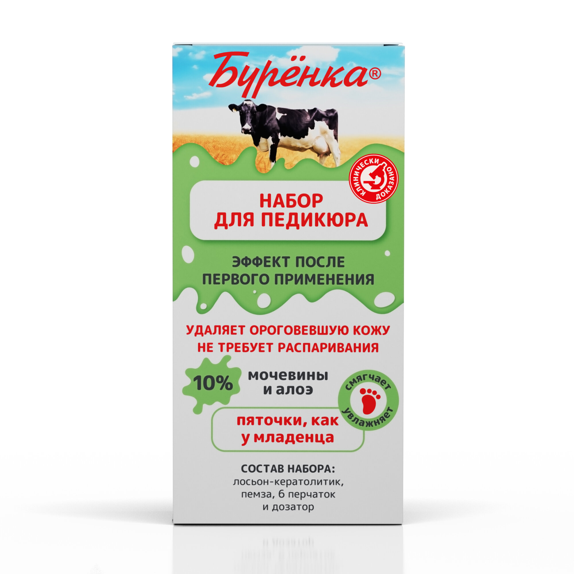 Кератолитик для пяток крем для ног с мочевиной Буренка набор для педикюра удаления огрубевшей кожи, средство от трещин, мозолей и стоп + пемза и перчатки в наборе 500мл