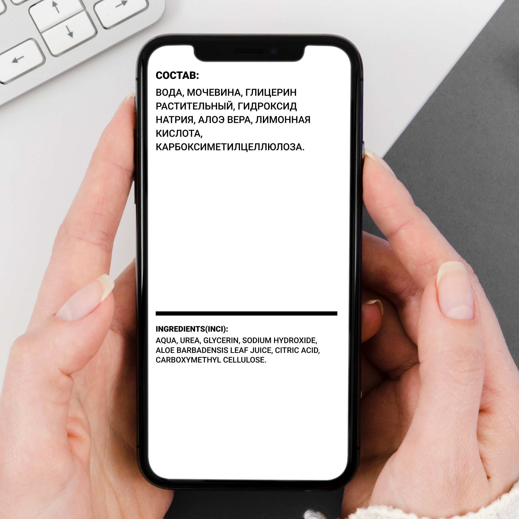 | Состав | AQUA, SODIUM HYDROXIDE, UREA, GLYCERIN, ALOE BARBADENSIS LEAF JUICE, CARBOXYMETHYL CELLULOSE. |