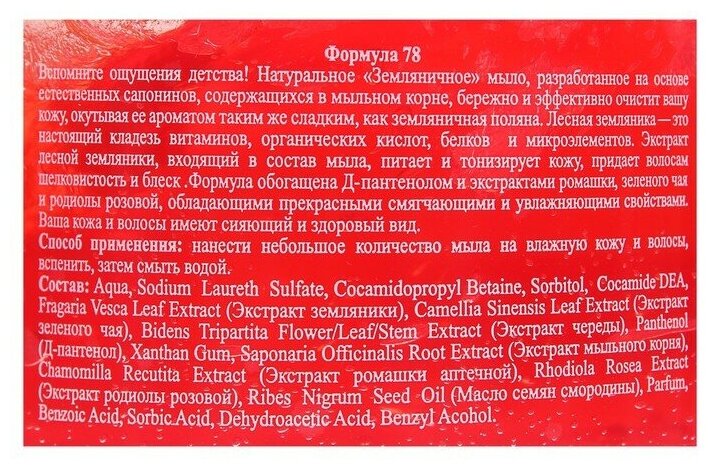 Запах, большой объем, многофункциональность, шикарная пена Недостатки: Ненатуральный состав Запах настоящей земляники, пена пушистая, нежная. Много применений. Я использую как: 1. Гель/мыло для душа 2. Пена для ванной 3. Гель для бритья Жаль, производитель обманывает насчет натуральности |