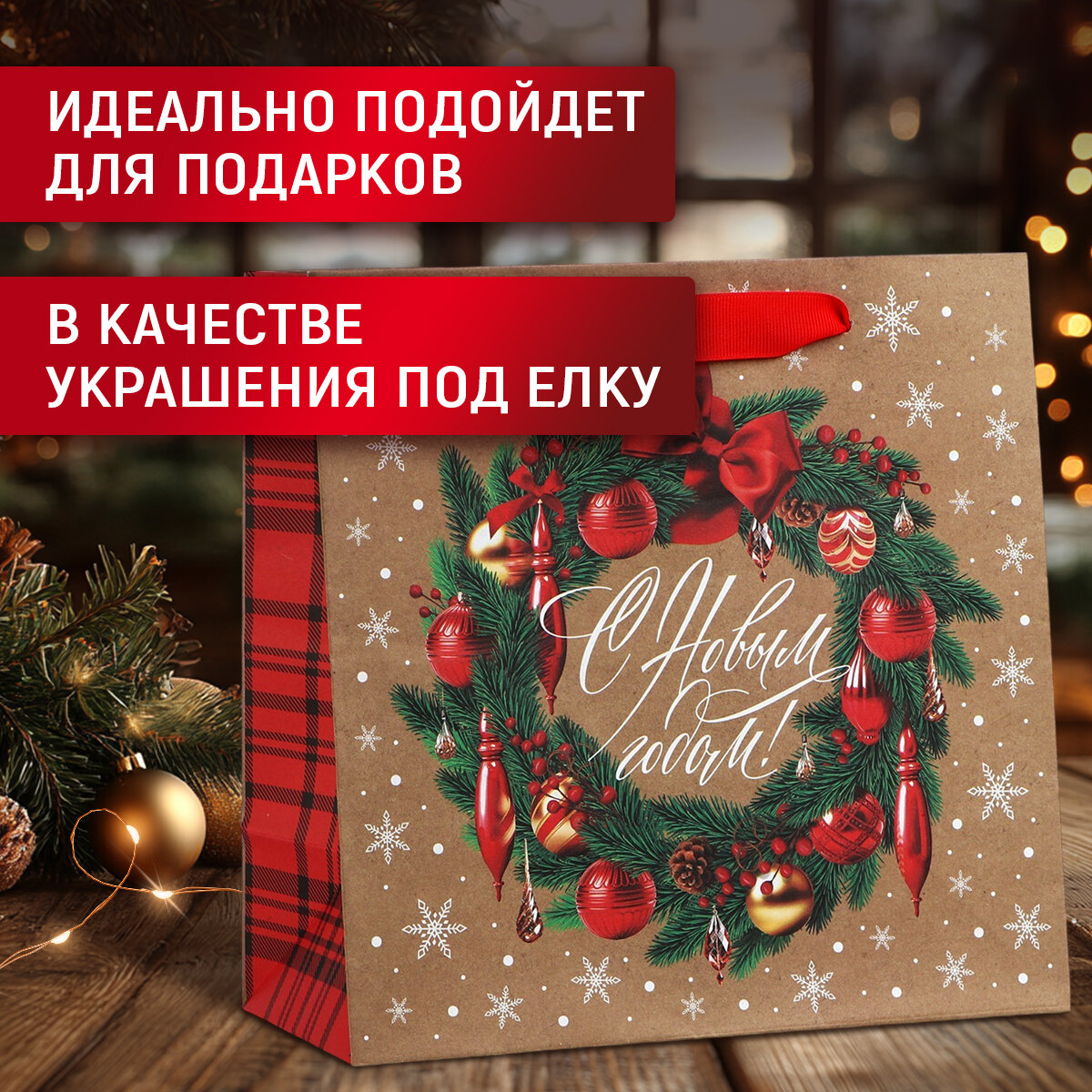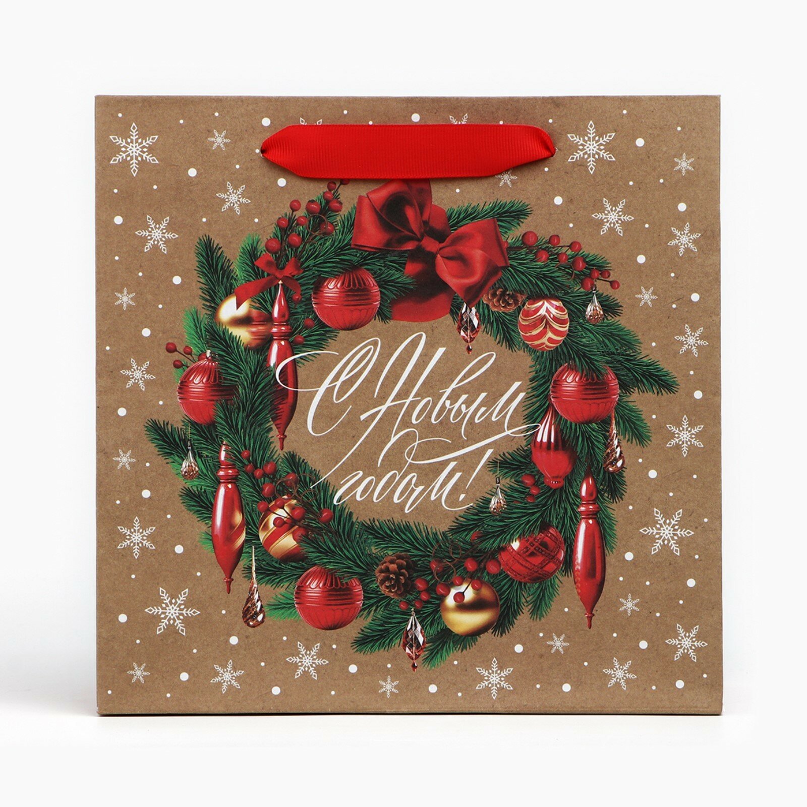 Купить Подарочный пакет «Новогодний венок», 22 х 22 х 11 см, для упаковки подарка на Новый год