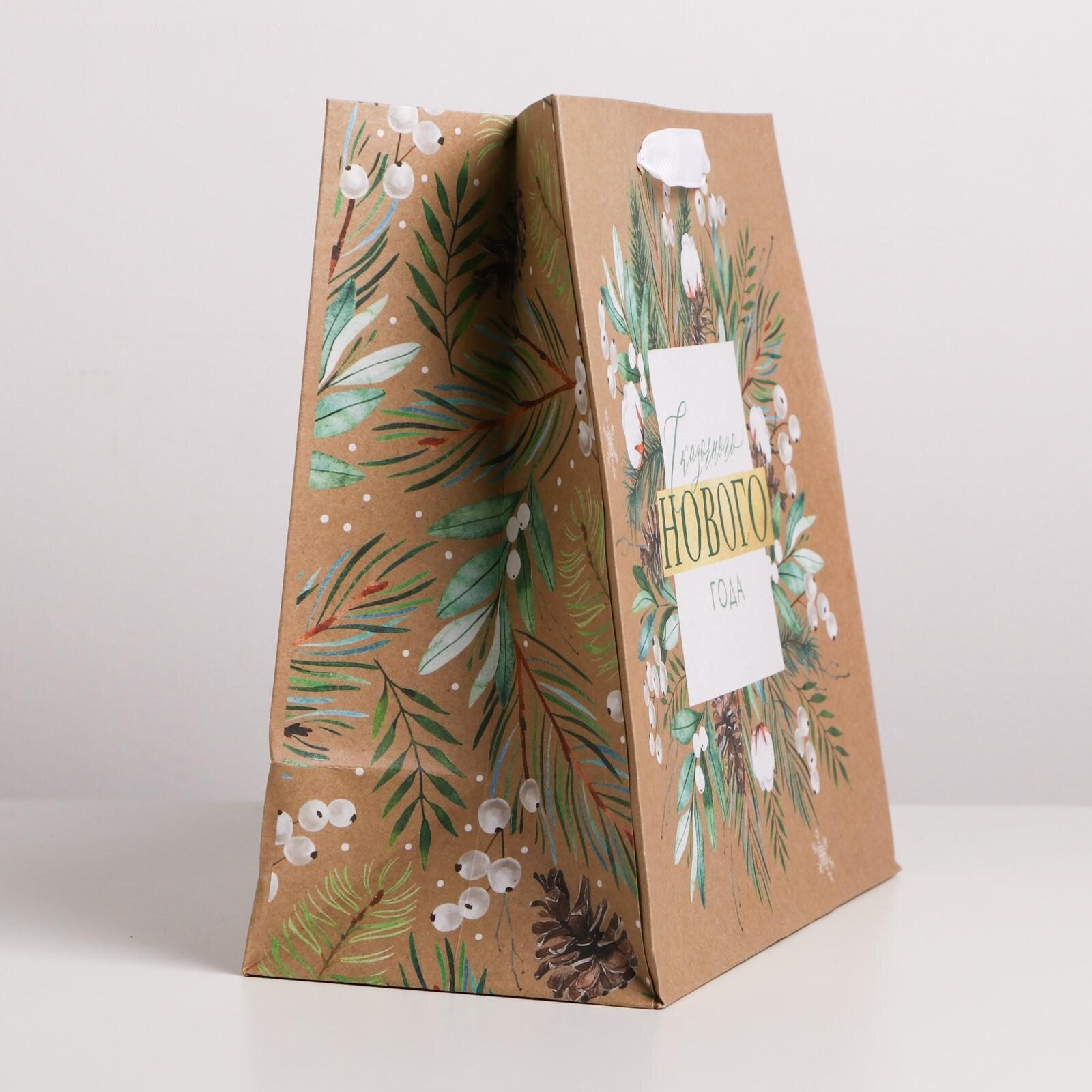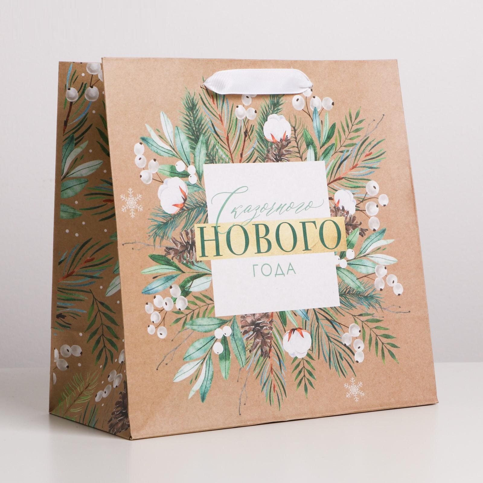 Пакет подарочный новогодний крафтовый квадратный «С Новым Годом», 22 х 22 х 11см
