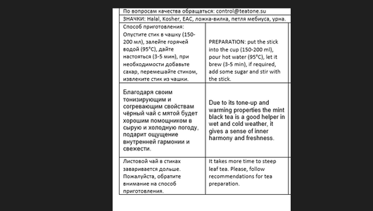 | Способ приготовления | опустите стик в чашку (150-200 мл), залейте горячей водой (95°C), дайте настояться (3-5 мин.), при необходимости добавьте сахар, перемешайте стиком |
